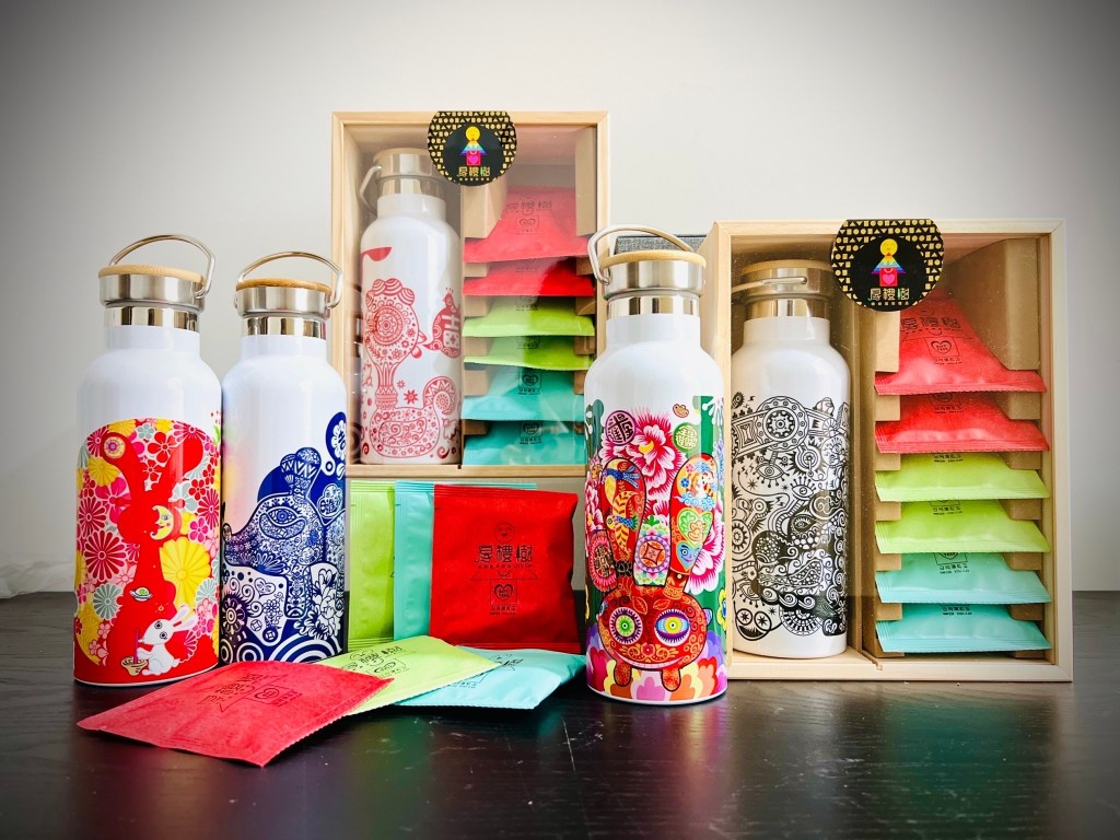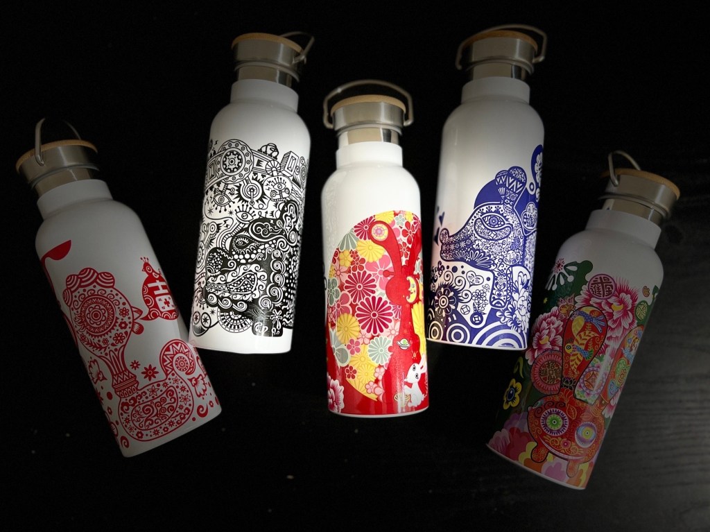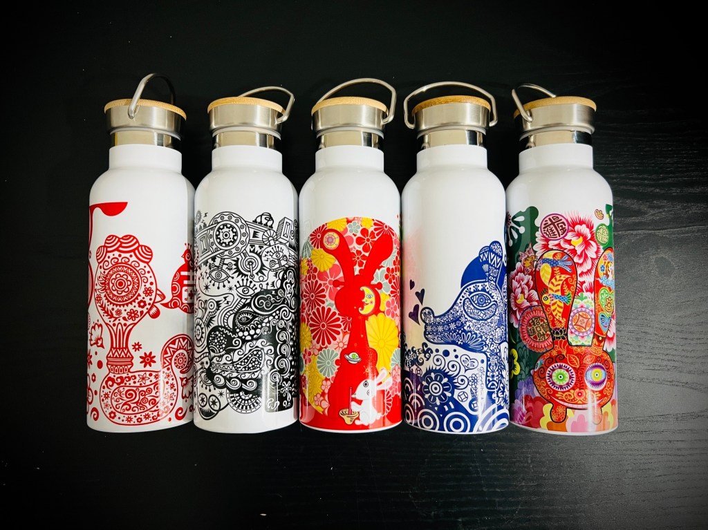 竹蓋保溫瓶:「大頭雞-紅剪紙」,「狗-藍青花」,「福龍-黑機械」,「鴻兔-彩色」,「兔爺-客家花布」