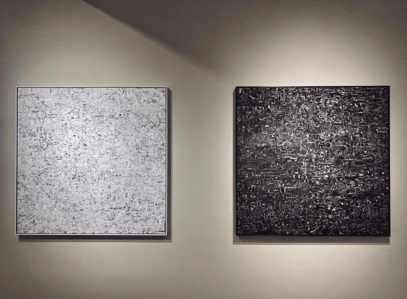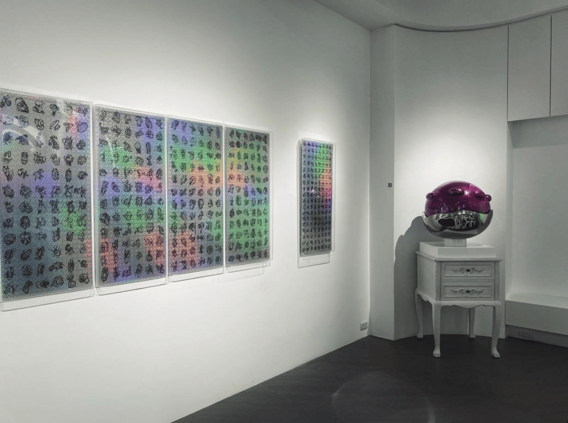 本次展出的《陌生星球集合系列 — — 星球寶典》四幅連屏,延伸自過往代表作之一的《空間的詩》,藝術家在畫面中分別精選其長年以來所發想繪製的近6,000種形似飛行器、太空船等具有未來性的機械圖,透過如同書藝詩句中方塊字的佈局形式,產生此作連續性的詩意空間,又以雷射輸出材質作為基底,在光線的折射與視點的位移之下,產生霓虹與金屬質地般的迷幻效果。許唐瑋認為,外太空、天文科幻場景,遠比人類視覺所見的空間更加富有層次與距離感,因此試圖將時空壓縮,使其作品近乎扁平化,卻又以流暢、彎曲且粗細不等的線條,依循物件的結構暗示出其中的立體空間效果,有別於「超扁平」的視覺概念,更增添對於物件量體上空間細節的描繪與設色。此表現手法,亦延伸至《玉花瓣》、《虹光樹:幻想新芽》等系列立體作品中,除了將整體物件結構更加立體化之外,同時又以如同造物主的身份,孕育出《想像的甲蟲系列》的全新物種,藉由裝飾性的圖樣以及螢光系的配色,在不鏽鋼與烤漆材質的表現下,裝置上方的結構感與金屬光澤,更顯未來感。