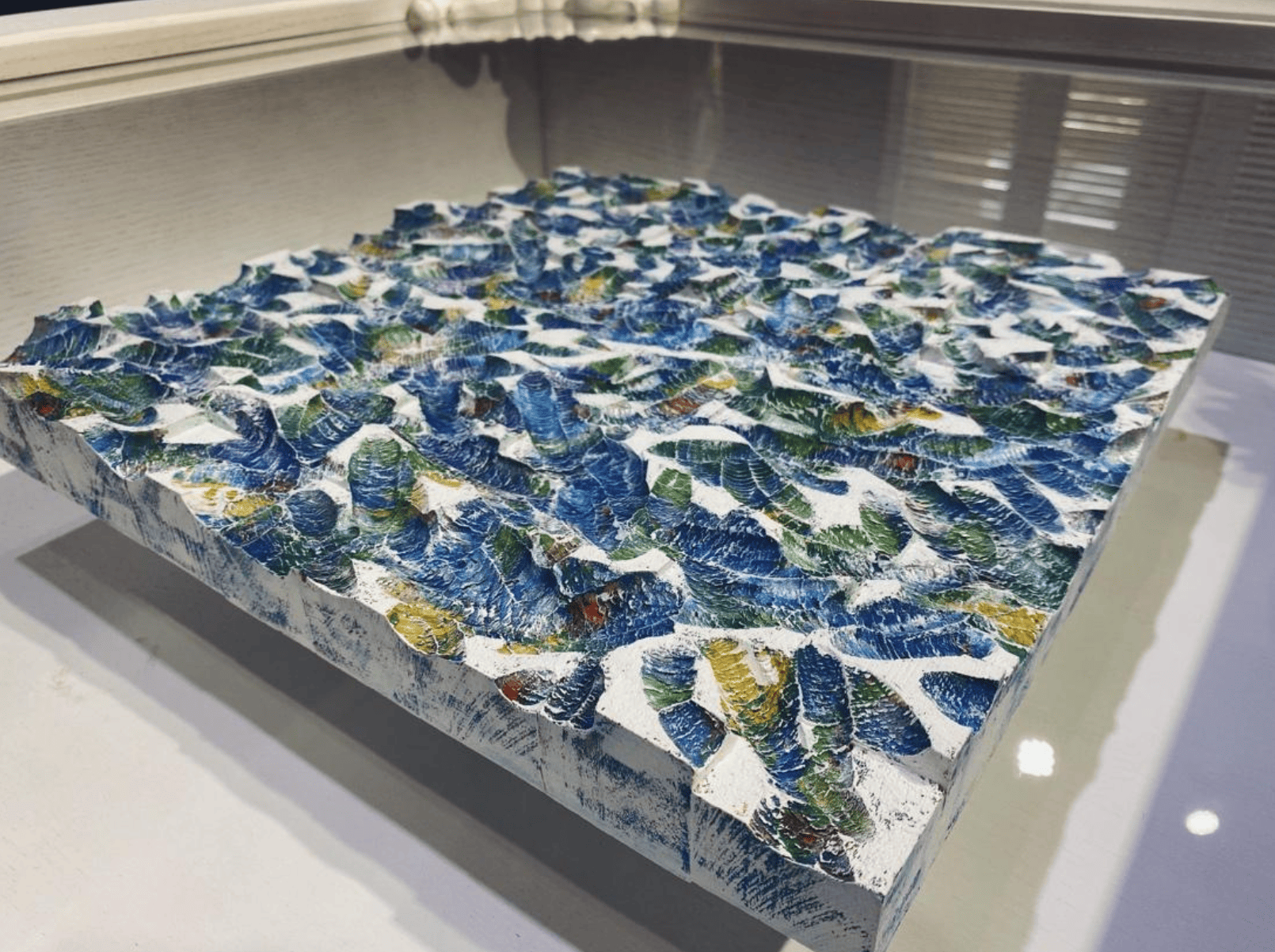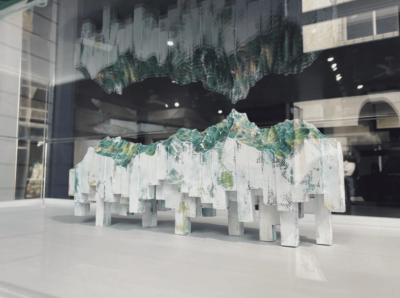 在同一場域中展出由水谷篤司所創作的木雕岩彩,其生於日本岐阜市,一座由群山溪流包圍、自然資源豐富的城市,為人熟知的古民家建築特色與當地的傳統文化,至今依然被完整的保存著。藝術家自求學至出道以來,時常遊歷於沖繩與臺灣之間,在反覆移動與居住的經驗中,日漸造就他對於各地山川、城市地景與歷史演繹間的深刻反思。