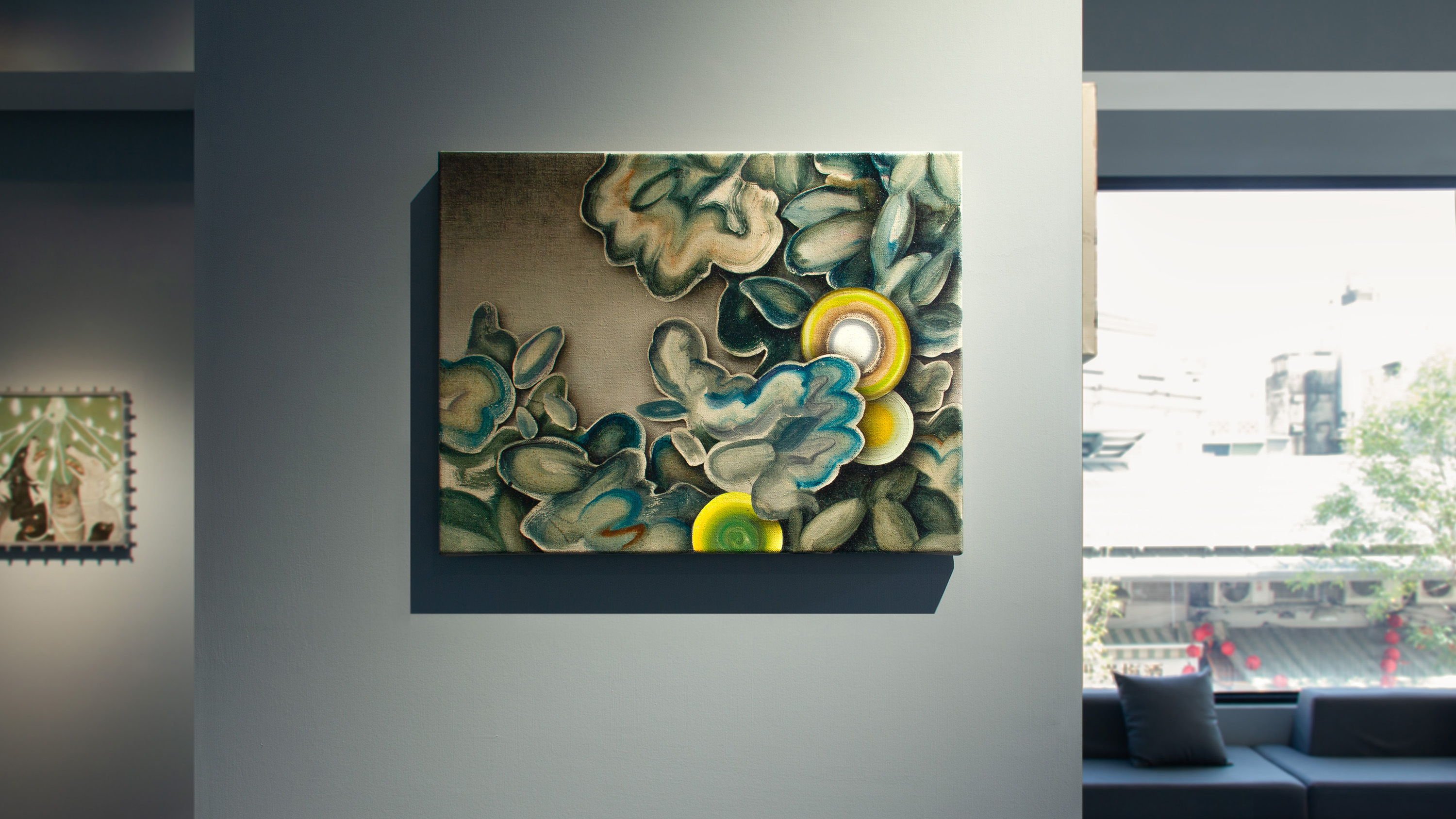 對我來說《採集的位置二》是創作的新探索。因為以前不常使用黃色,並不是不喜歡,而是對這個顏色沒什麼感應和想法。直到畫這件作品時,在想樹叢該如何表現,猶豫了很久後,腦海中浮現「黃金樹叢」的想法,於是乎用黃色填滿大半的畫面,非常滿足。