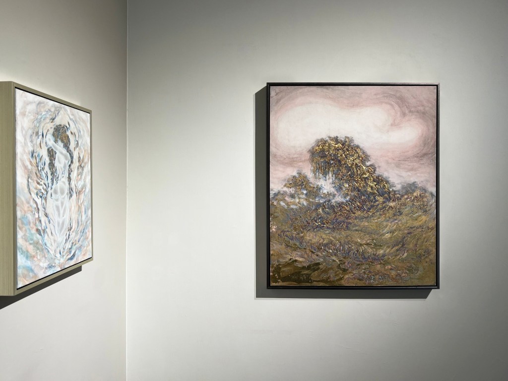 於此,我們試著將環境與人的狀態納入相同的單位,這種看法使得不論原本的狀態為何,都能夠在相同的狀態中達到平等且雙向的關係。儘管只有少數人具備某種天賦,懂得如何將狀態切換至與周遭環境相同的頻率,進而達到能與環境建立聯繫和感知的境界,但其實每一個人皆能透過學習,以自我對話的方式達到上述狀態。這與創作狀態概念相似,當人們透過創作調整精神活動,達到身與心的頻率平等連結時,就能感知或連結世界萬物的能量和波動,使得環境、人的關係與能量單位都成為相等。而在高安柏《山曰》與許瀞云《塵 萬物 我》的雙個展中,便能看見藝術家們是如何理解東方繪畫獨有的語境,以表達自身與環境間的細膩關係。