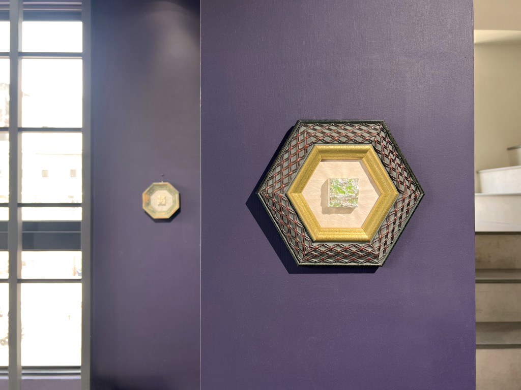 而藝術家許瀞云的《塵 萬物 我》,主要透過膠彩創作去探討肉體與精神,以傳達「形而下到形而上」的能量轉換。膠彩媒材中的礦物顏料和金屬箔代表著大自然中的原始元素,如礦石、泥土和金屬。她透過不同角度的畫面探討存在、自由和本能之間的關係,並以略帶宗教性的構圖方式呈現人與人之間精神上的多重變化與內外對抗,以及無法捨棄的原始慾望。
