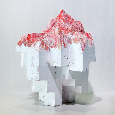 材料如何與經驗相⽣立體化?⽔⾕篤司⾃⼩於⽇本的⾃然群⼭中長⼤,⼤學畢業後長時 間⼯作⽣活於台灣,作為⼀位雕刻家,⽇常觀察與⽂化層次的體悟,早已轉化為他所熟悉的 ⽊質紋理與岩彩結晶,在其⼭形起伏、單純質樸的「景觀」開展中,我們不僅看到「時間洗 鍊」,也看到了⽣活經驗的感動;⽽若從材料的歷史縱深切入,擅長以少⾒的⽣漆為創作媒 材的夏愛華,則專注於探索⼈們迷離奇幻的集體潛意識。淵源於古代佛像,製作過程必須具 有細察氣候條件與質地變化的能⼒,完成後的細膩⾊調與肌理層次,富饒中則蘊含著⾃然的
