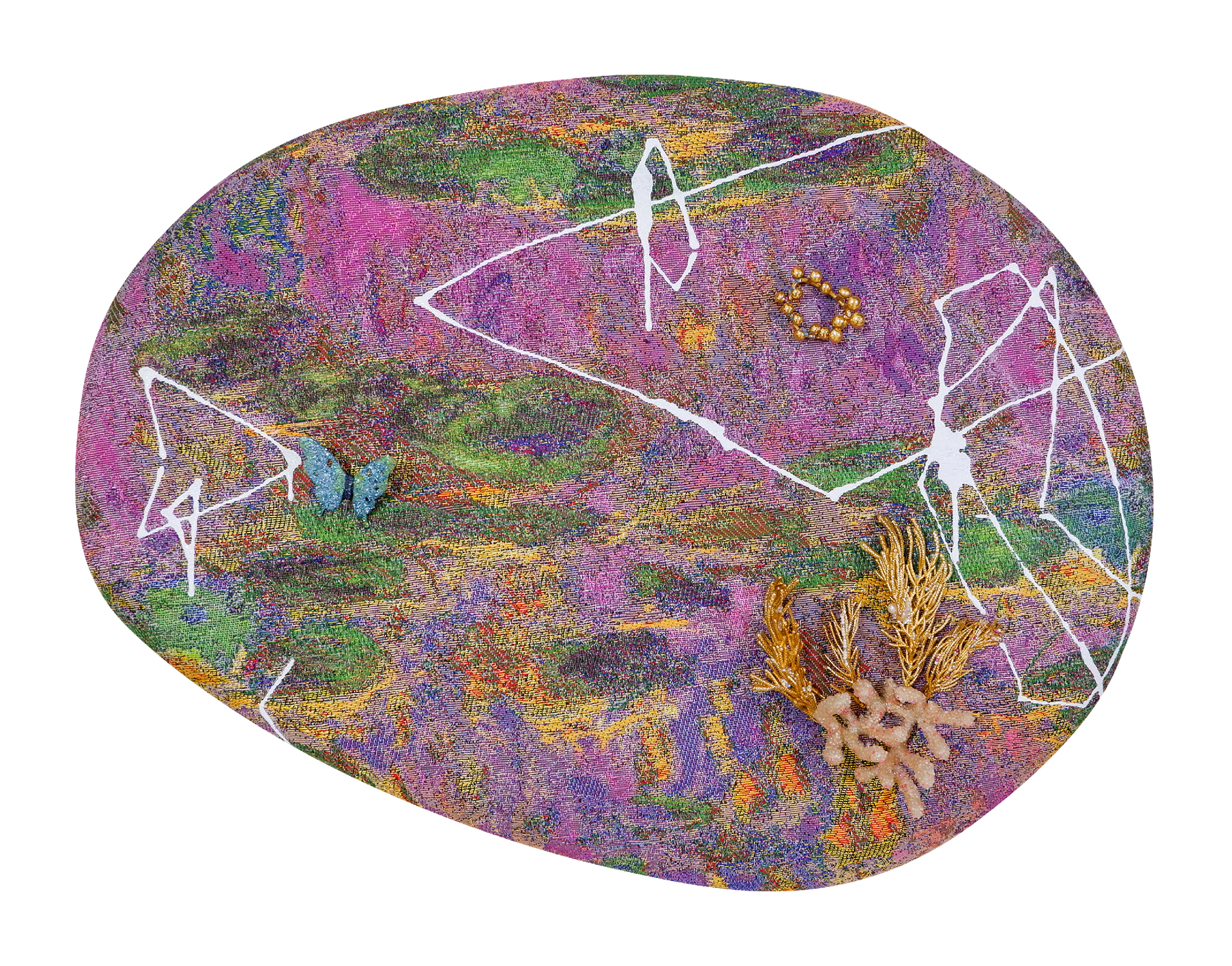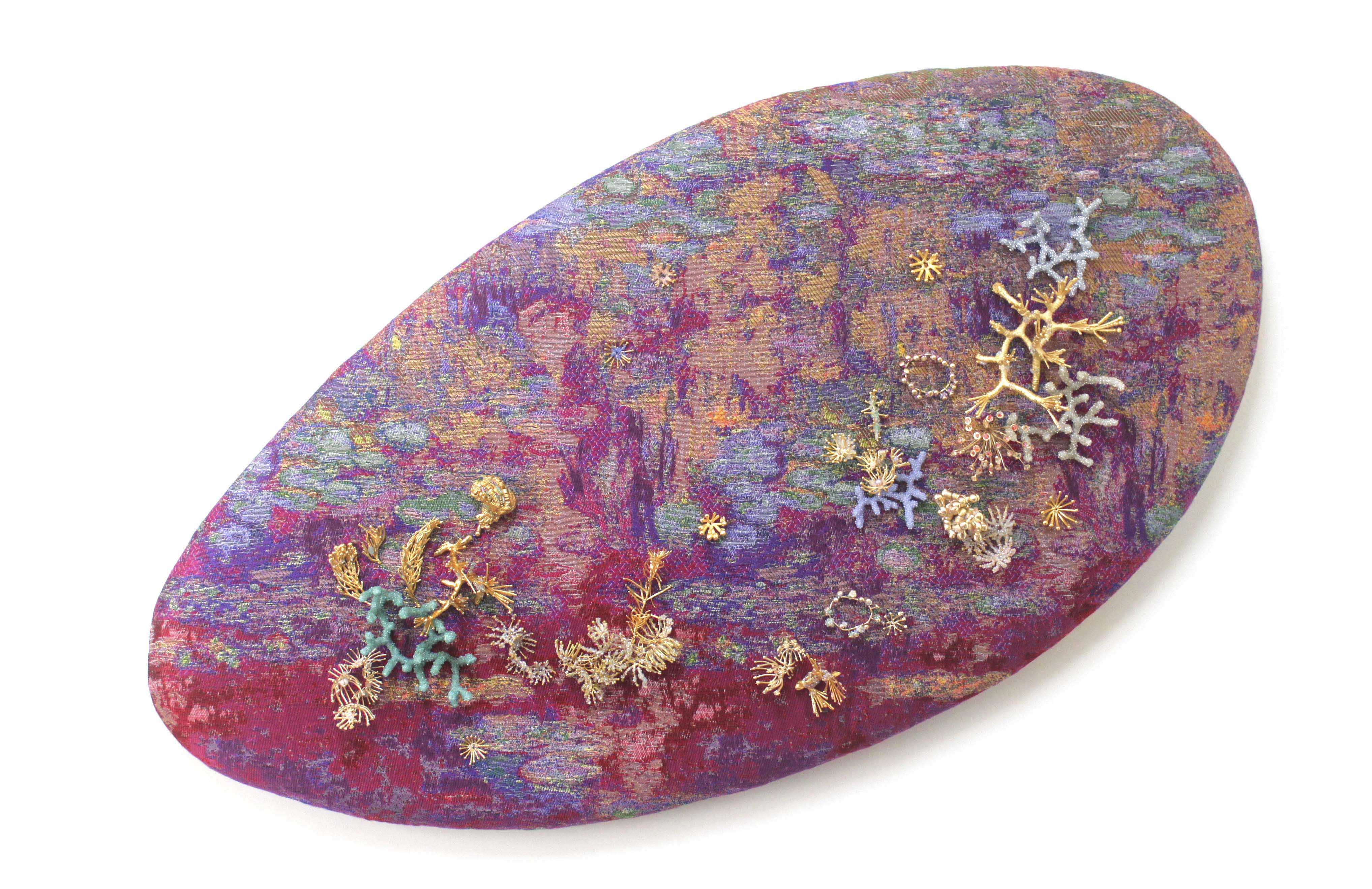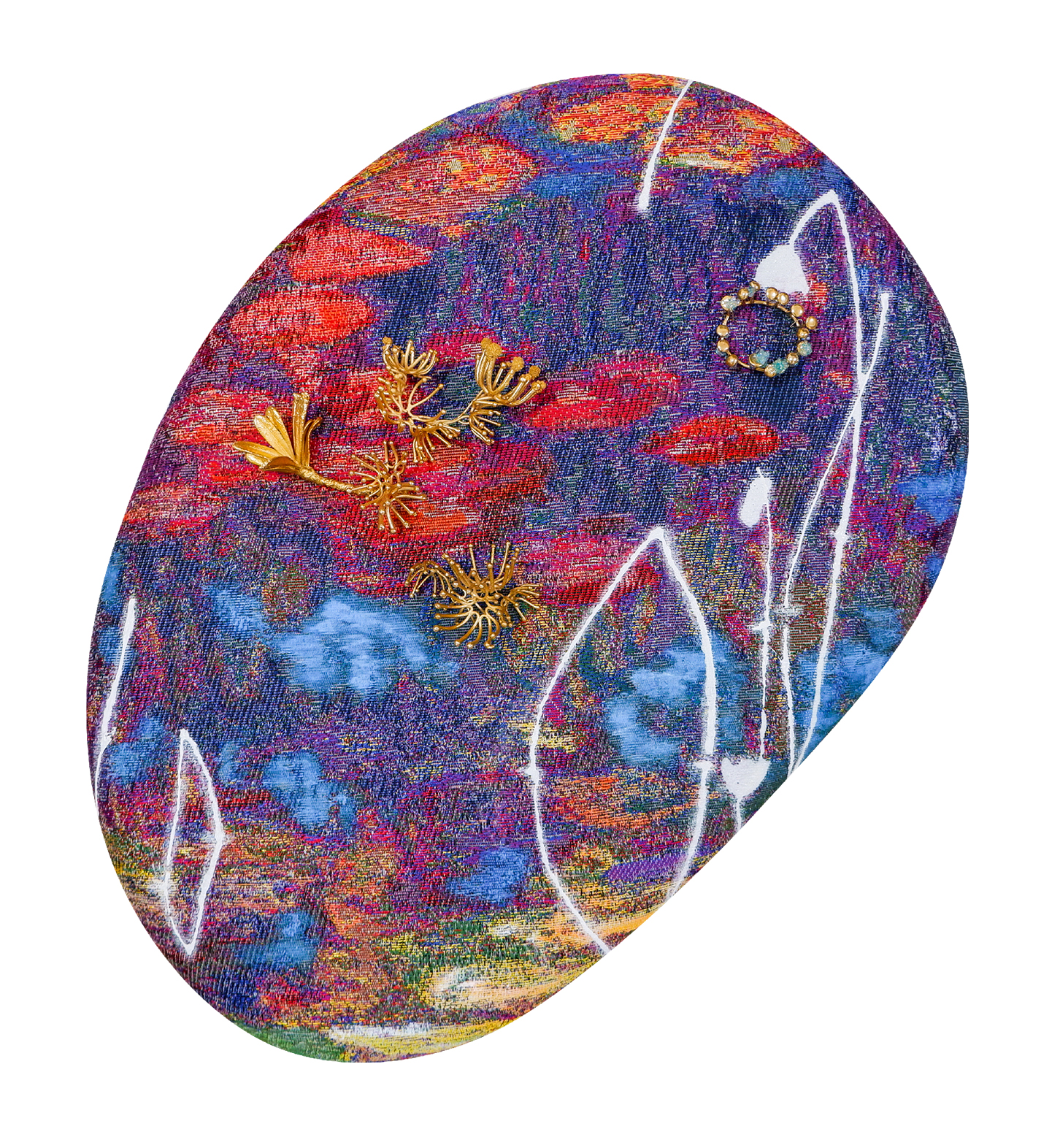 Cotton, Artificial Fiber, 18-20K Gold, Stainless Steel, Copper, Glass, Wood panels, Foam padding, Acrylic paint