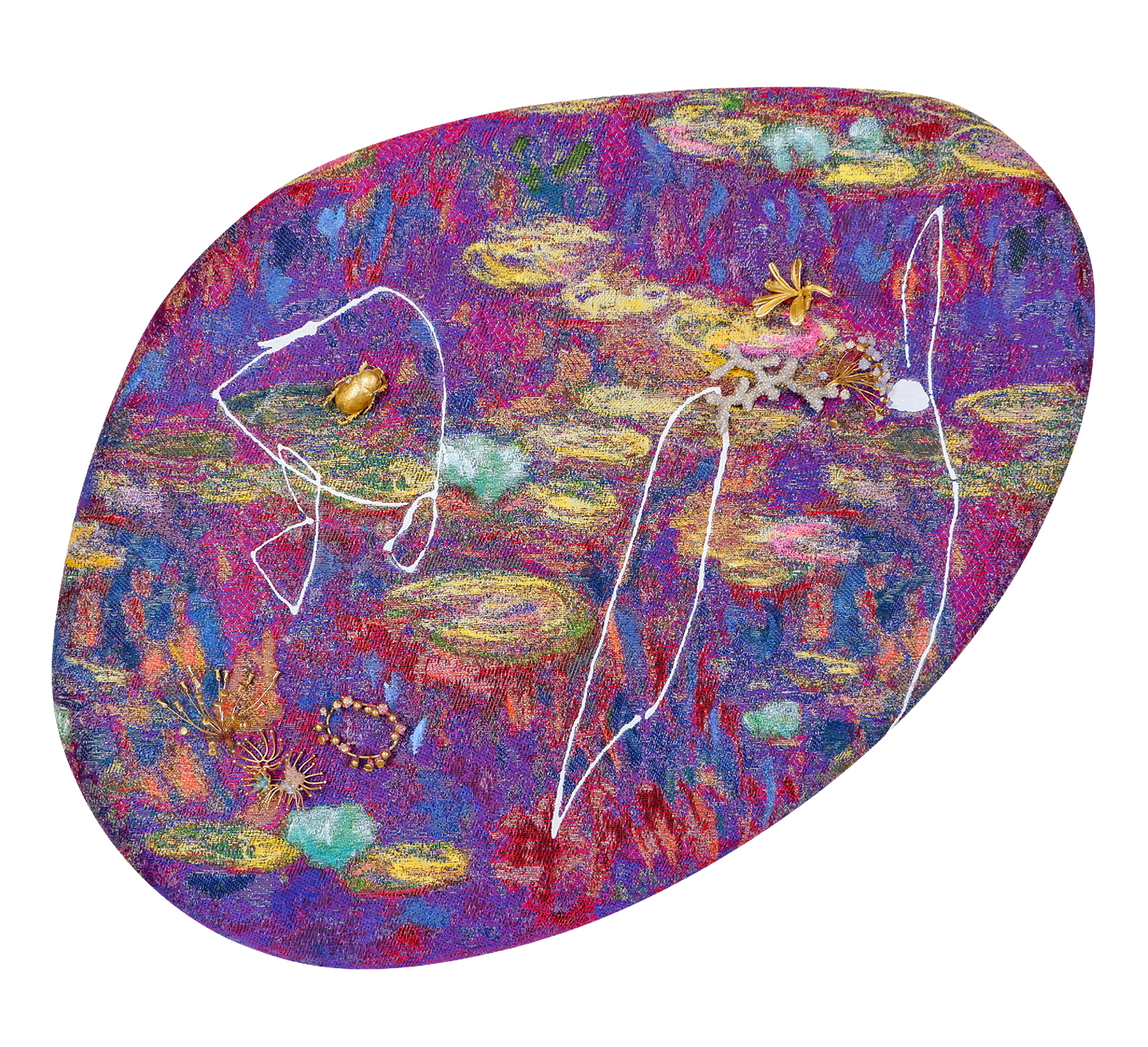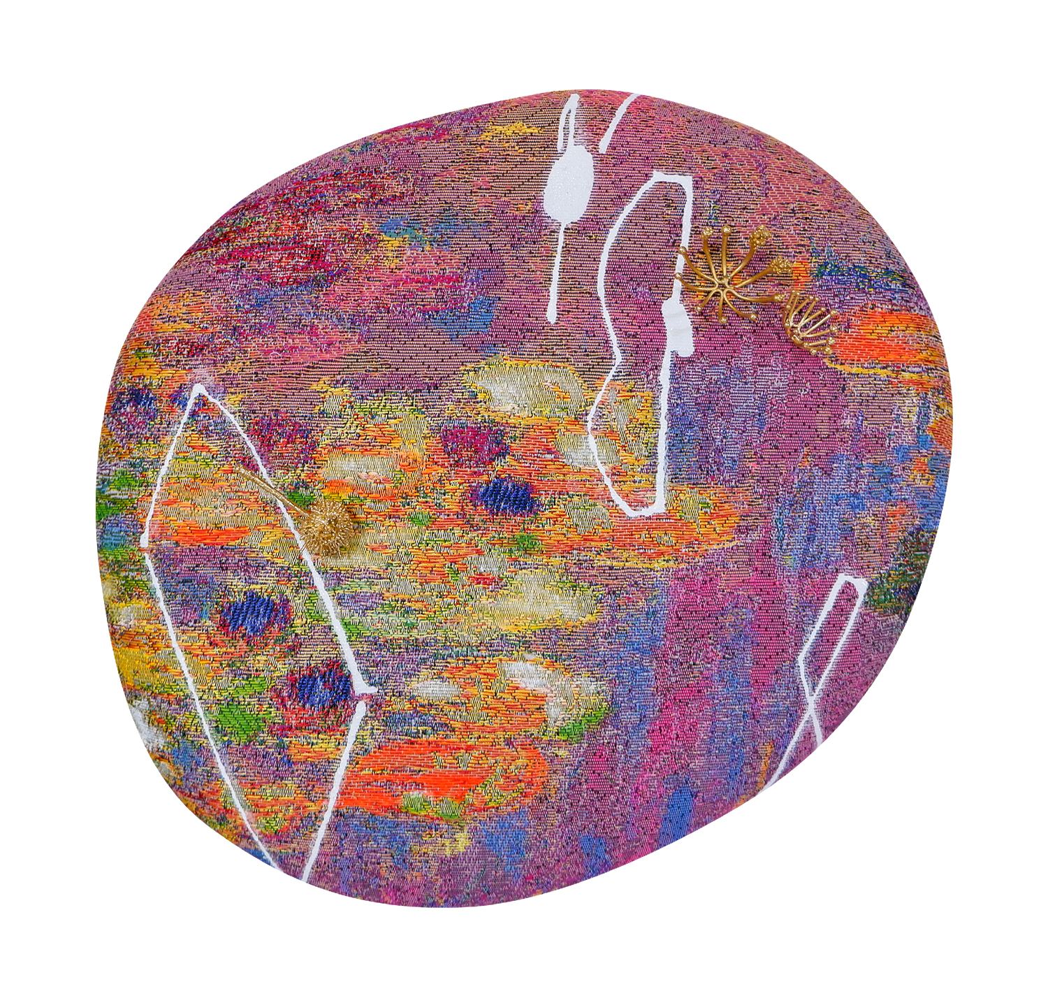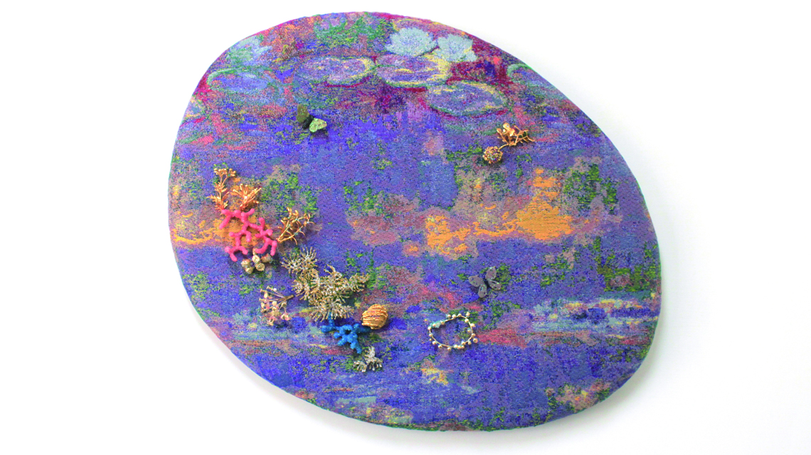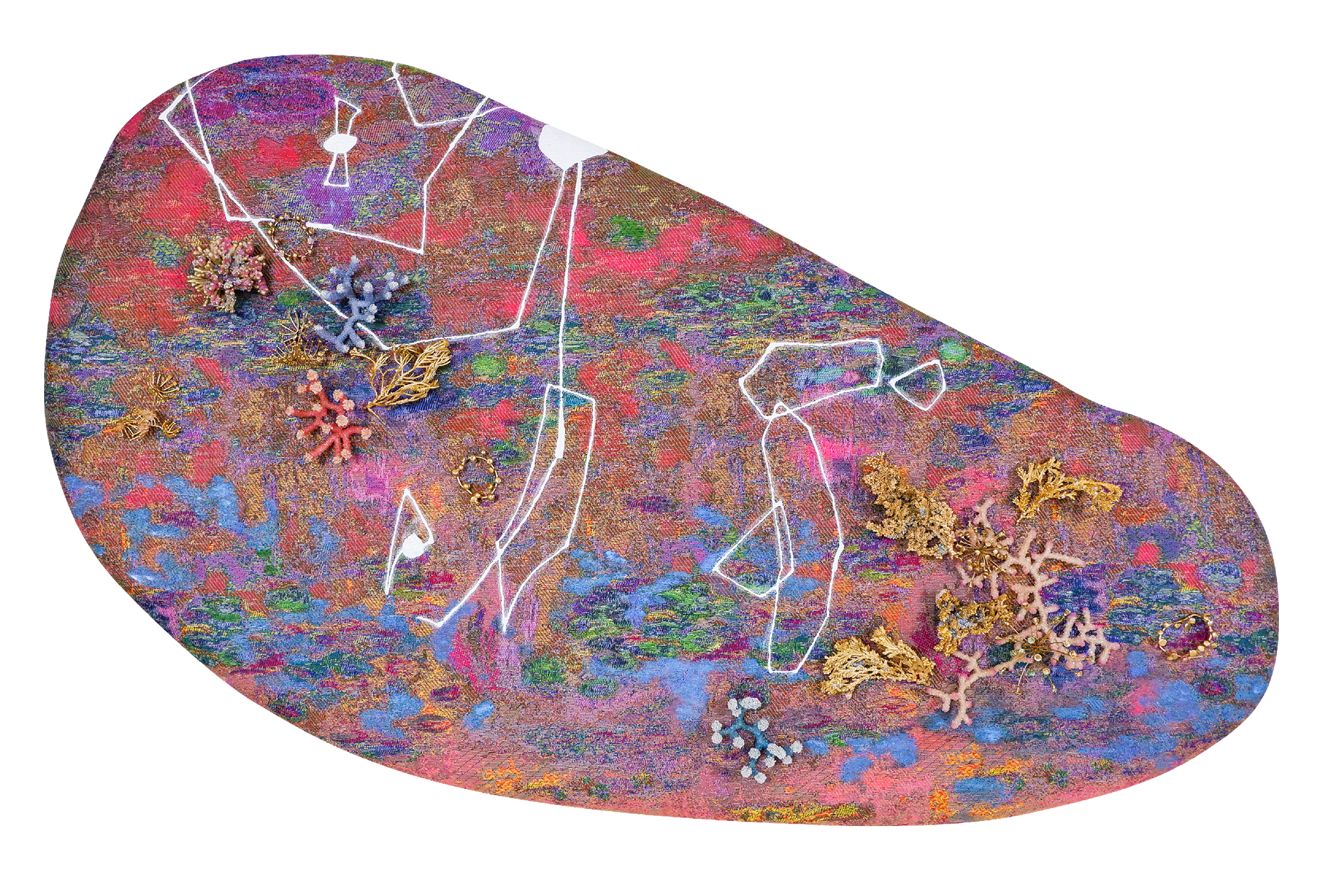 Cotton, Artificial Fiber, 18-20K Gold, Stainless Steel, Copper, Glass, Wood panels, Foam padding, Acrylic paint