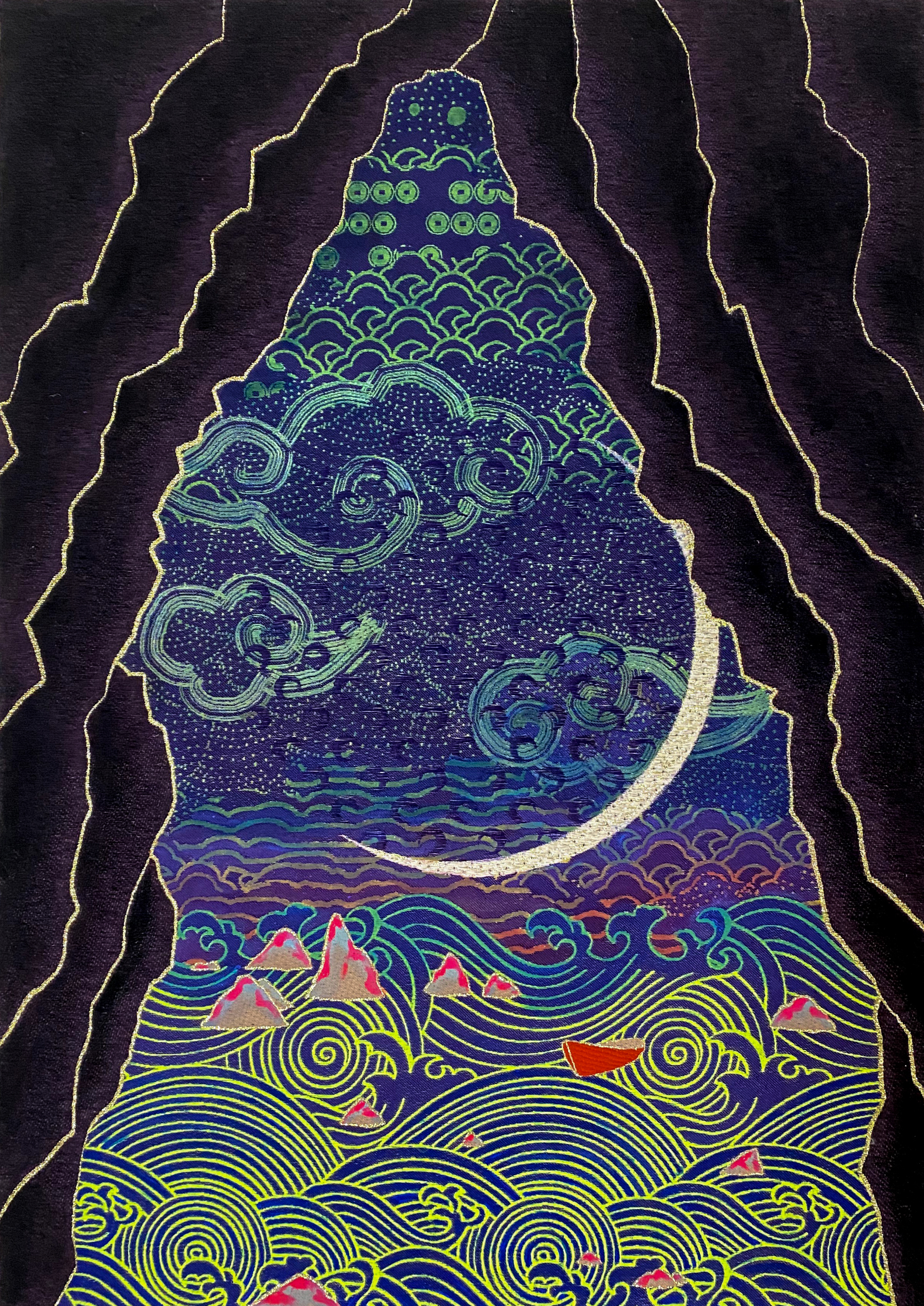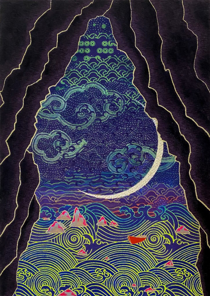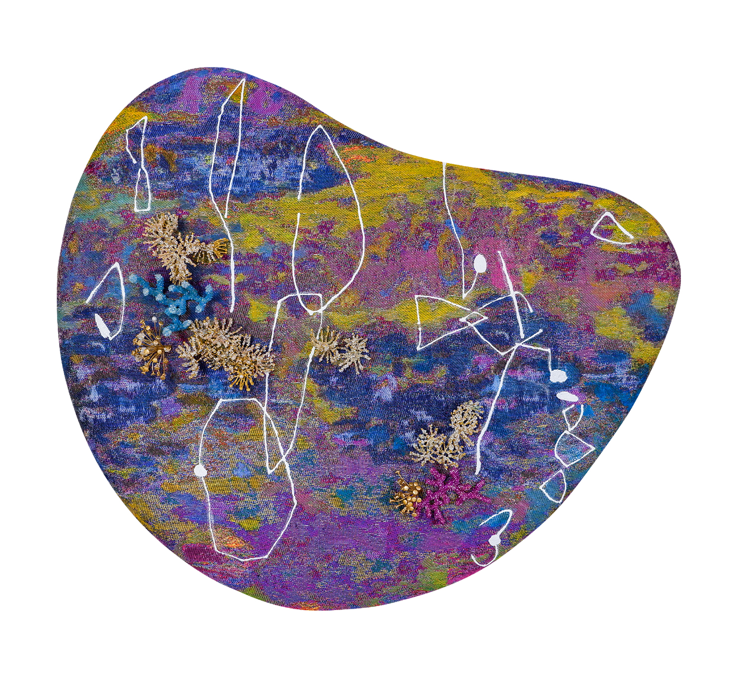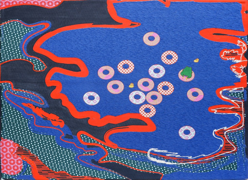 Cotton, Artificial Fiber, 20-24K Gold, Stainless Steel, Copper, Glass, Wood panels, Foam padding, Acrylic paint