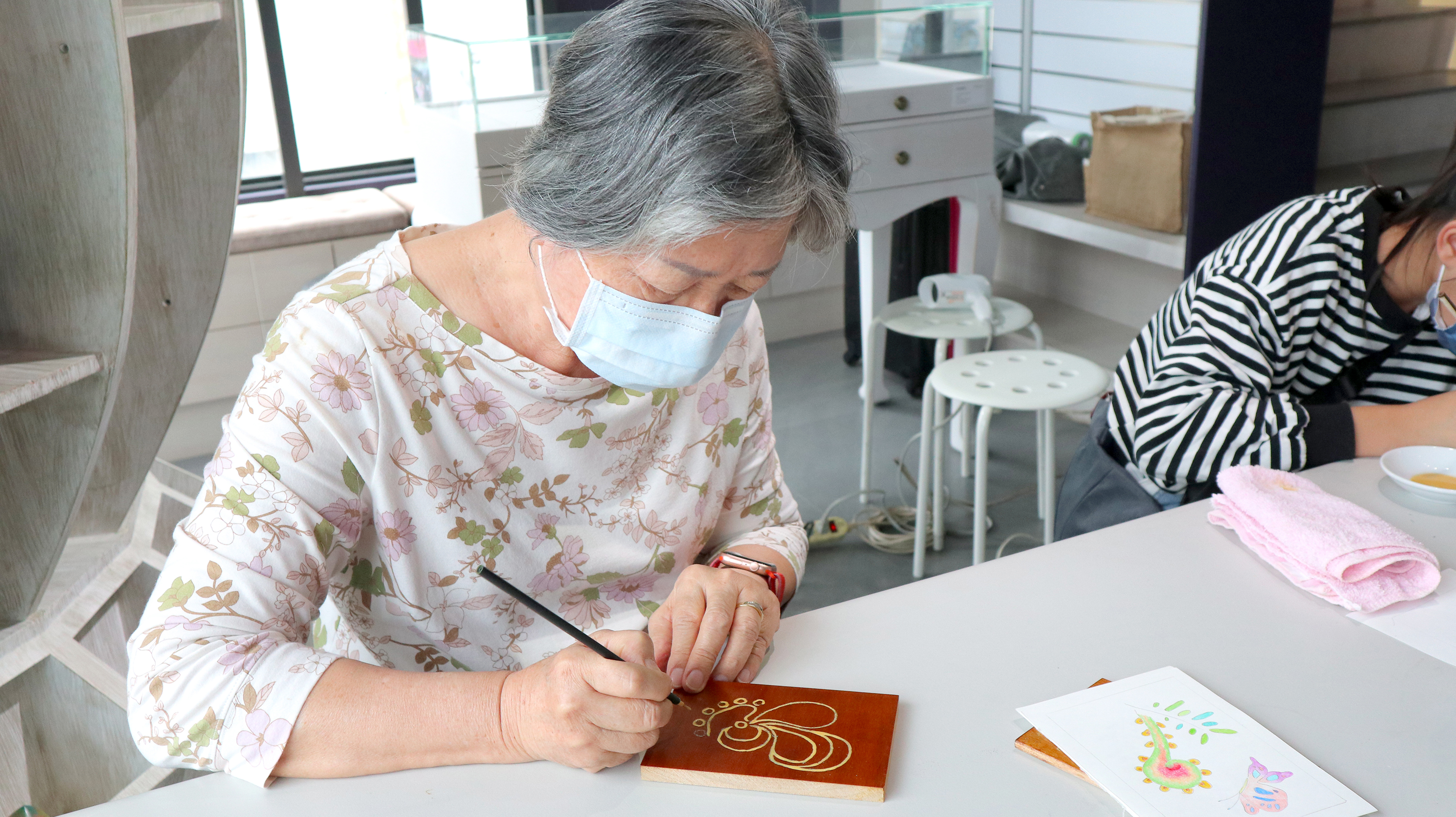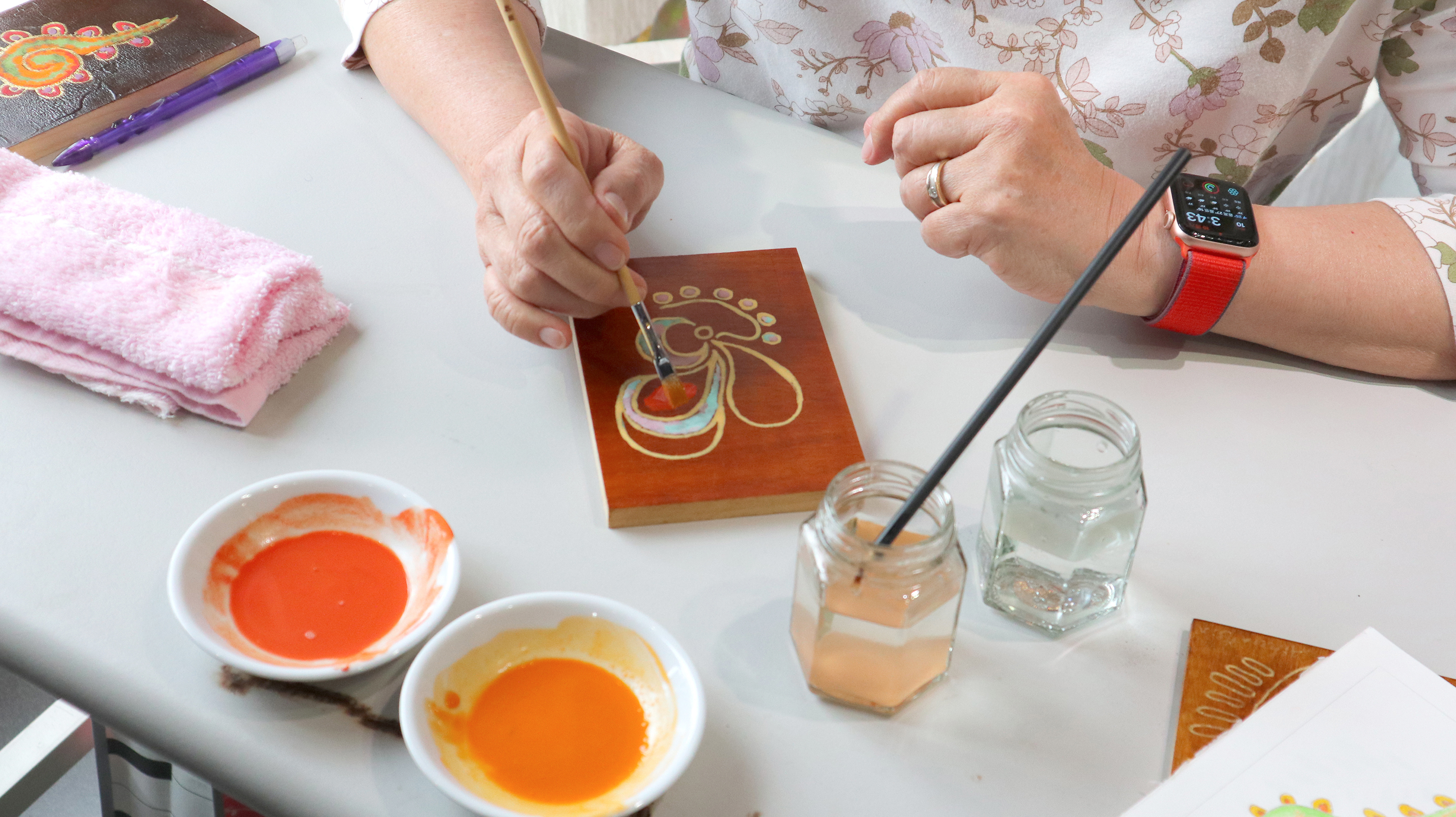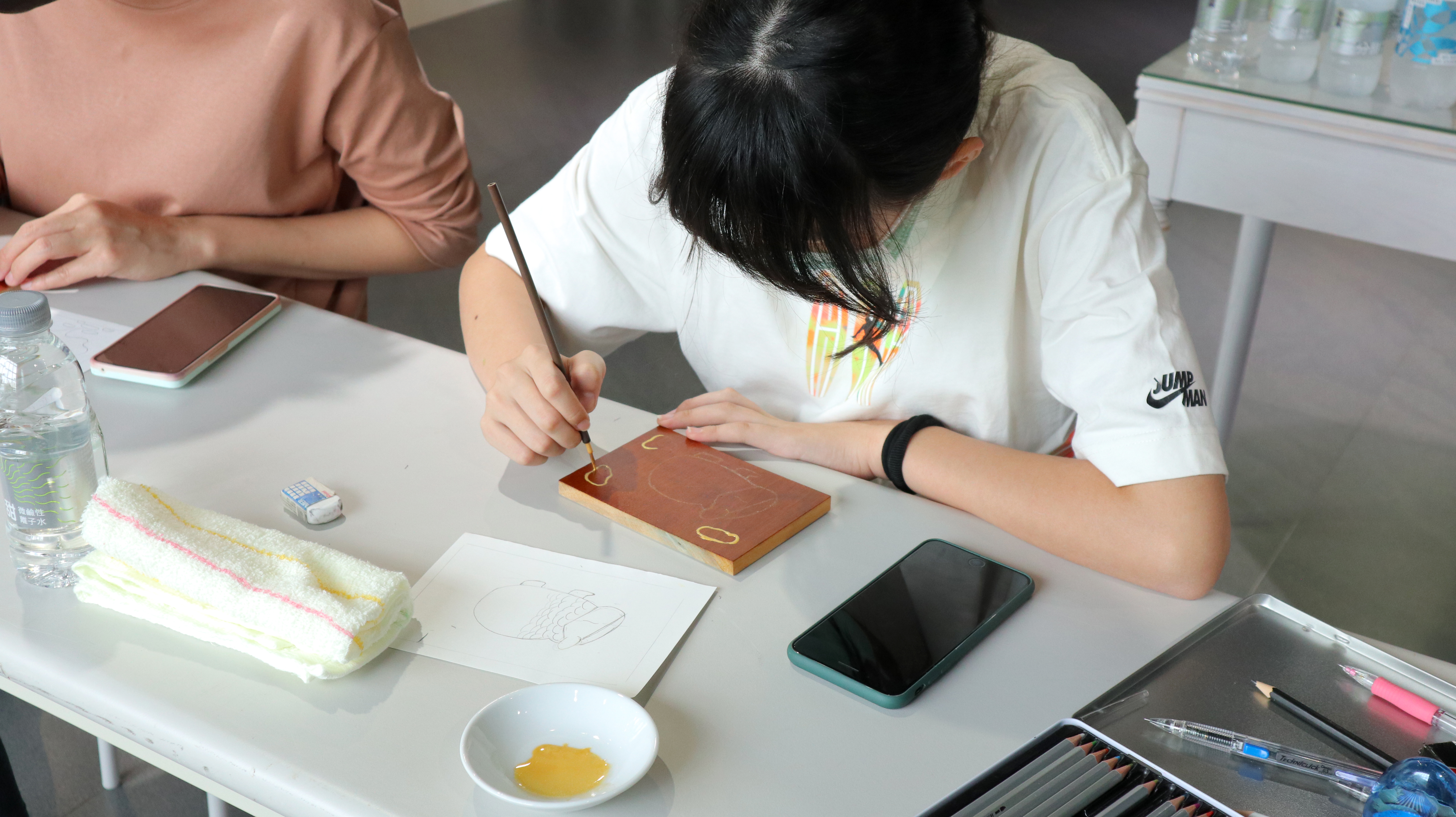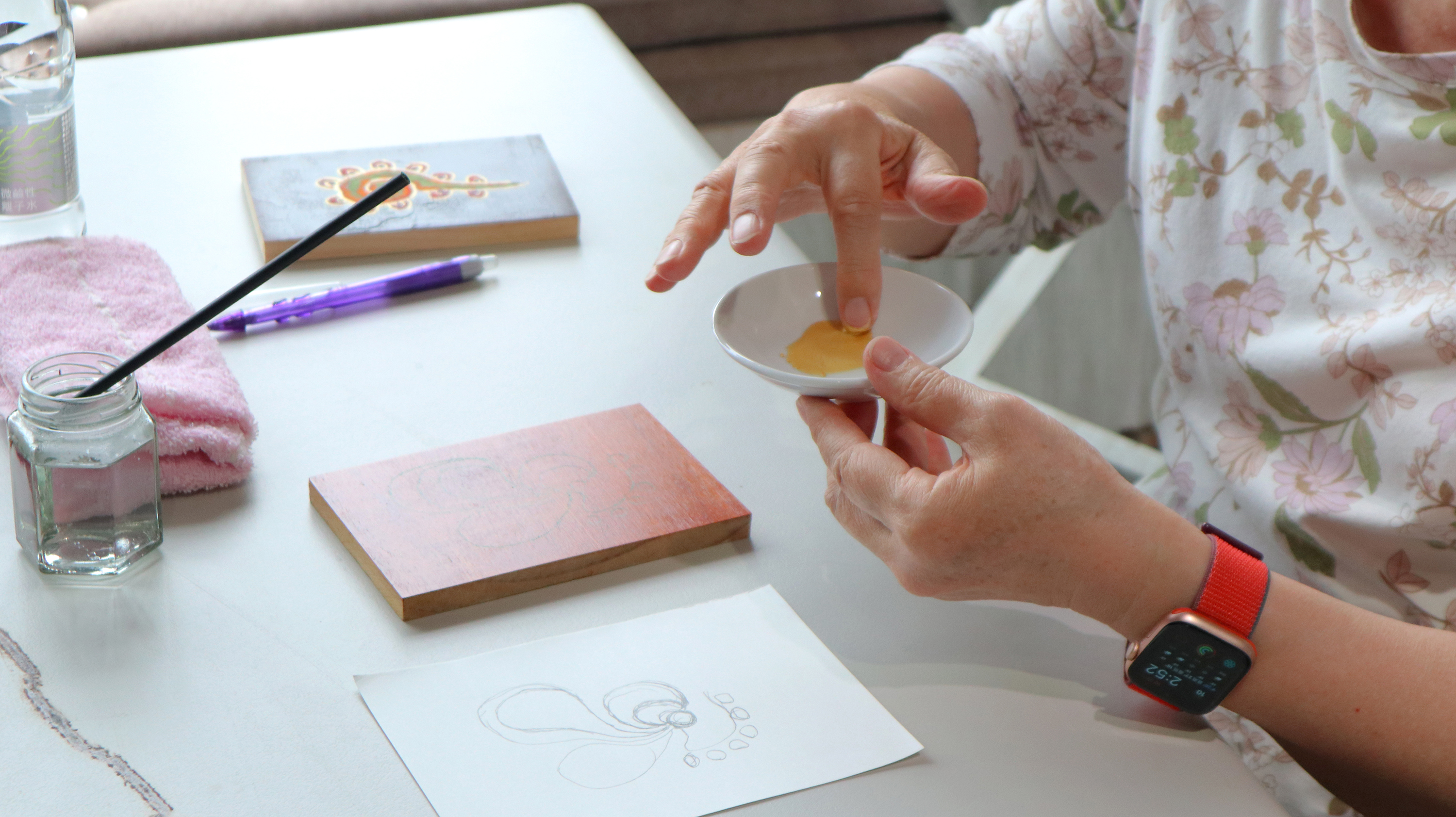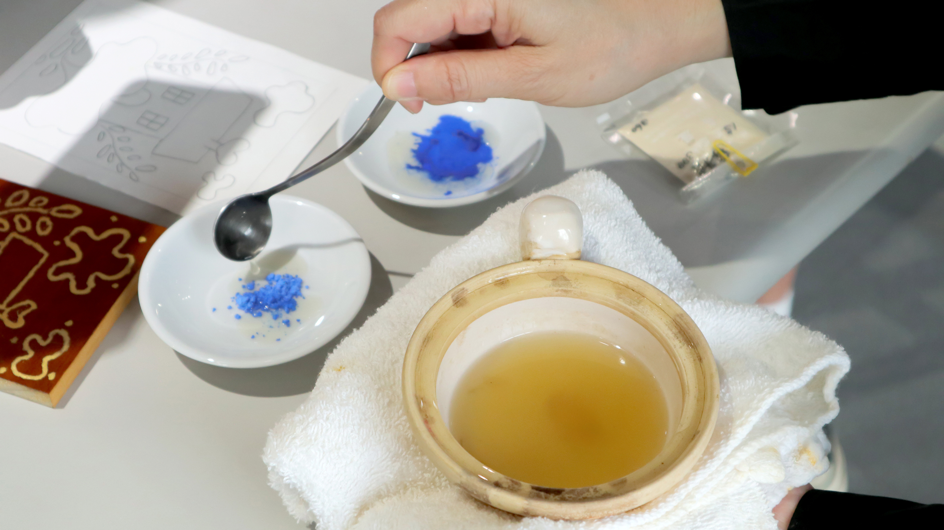 夏愛華老師在工作坊裡分享漆板岩彩的施作過程,首先 1.先在漆板上繪製草稿 2.再用珍珠粉製作的金色漆料描繪框線 3. 將不同晶體所磨製後的岩彩,加上鹿膠後,透過指腹的觸感去磨合調製,就能開始選用自己喜歡的寶石顏料上色。 4.因為工作坊需短時間內完成,為了讓顏料在不流動的情況下自然乾燥定型,過程中需用吹風機保持距離慢慢吹乾。