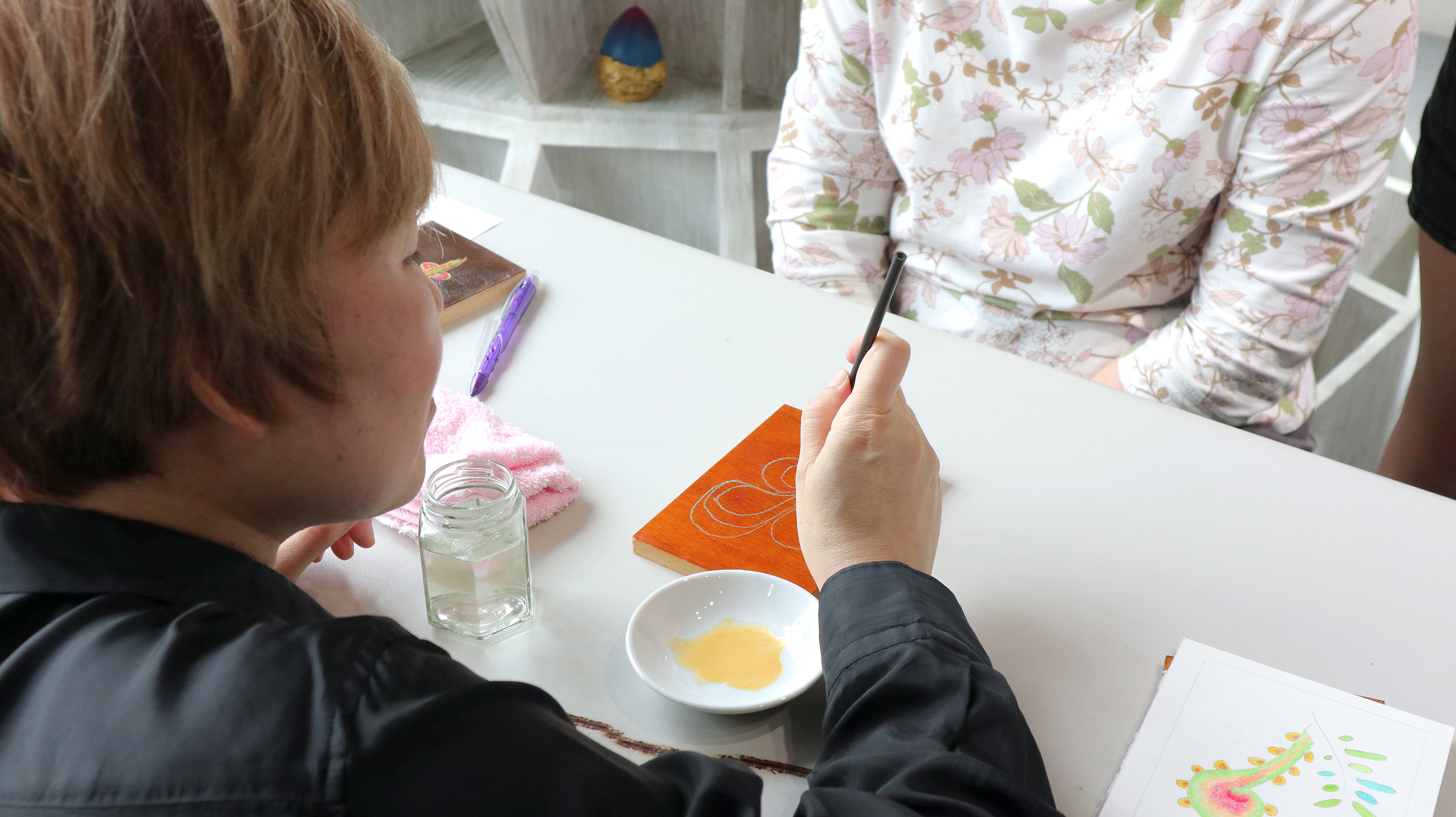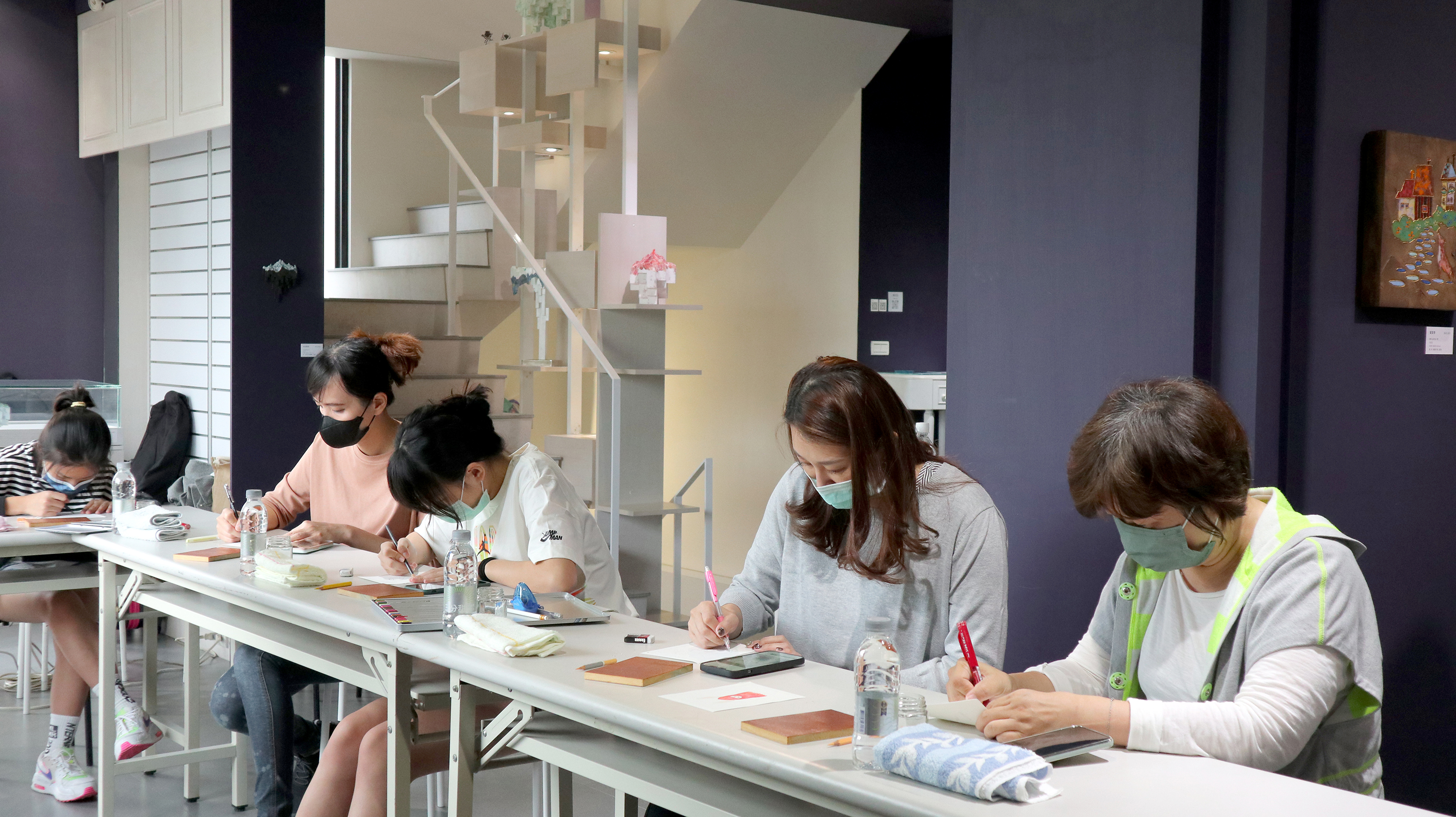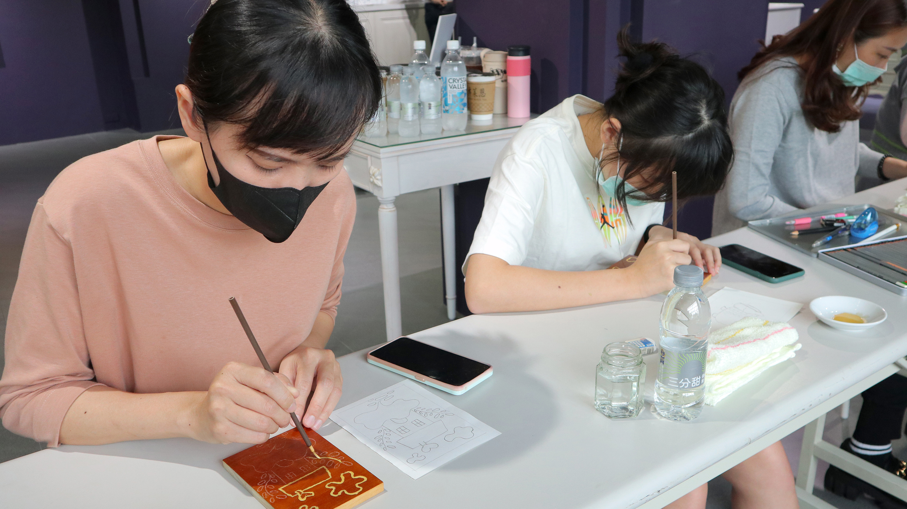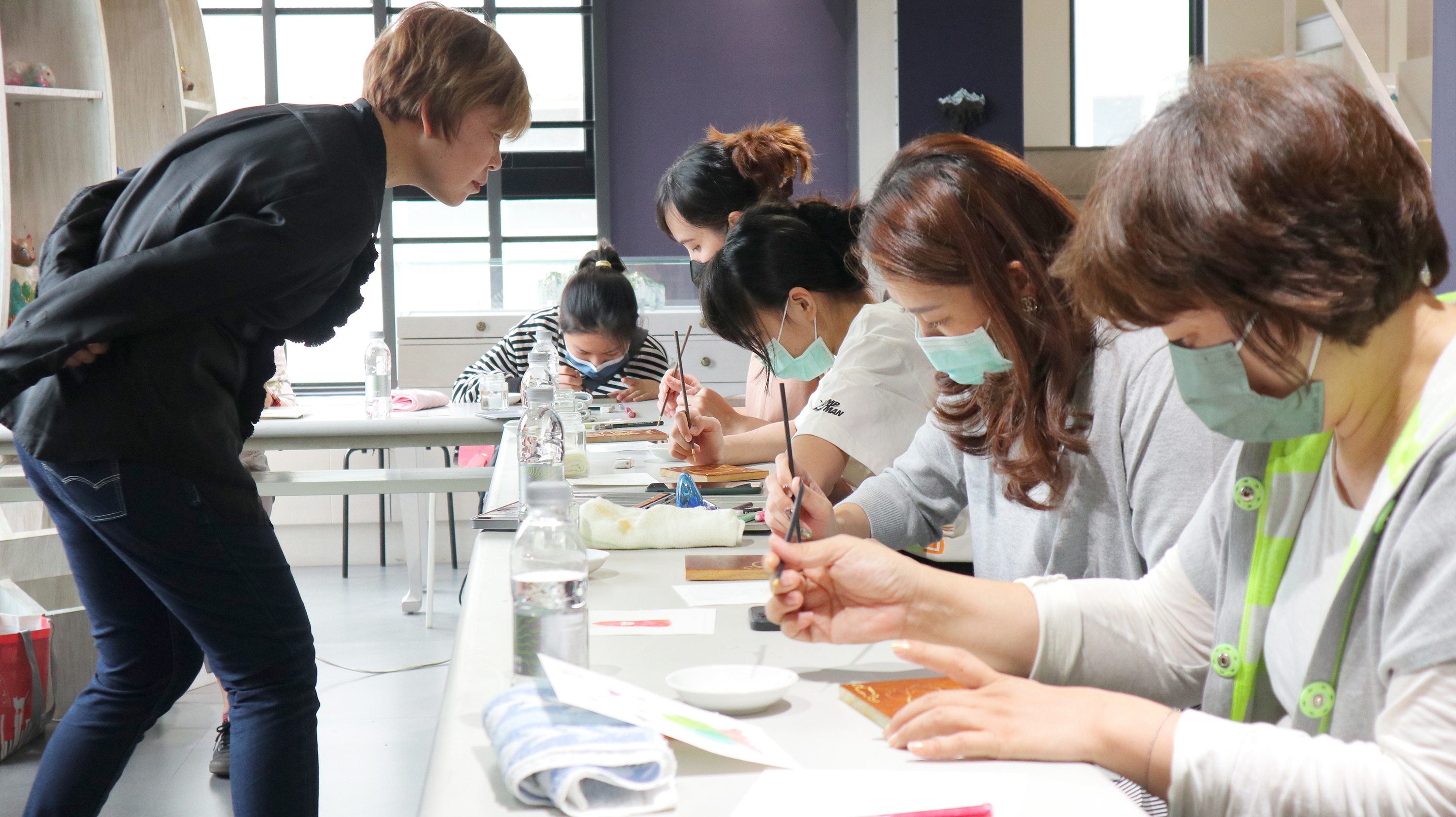 看似簡單的步驟,操作過程卻不容易,寶石顏料在濕潤的狀態和乾燥後的狀態截然不同,如何在濕潤狀態下確定做到暈染效果,及乾燥後達到寶石岩彩厚重效果,需經過長時間反覆的上色及風乾。學員們在這次的漆板岩彩的工作坊中,才發現原來要完成一幅寶石顏料的畫作是多麼不容易的事。