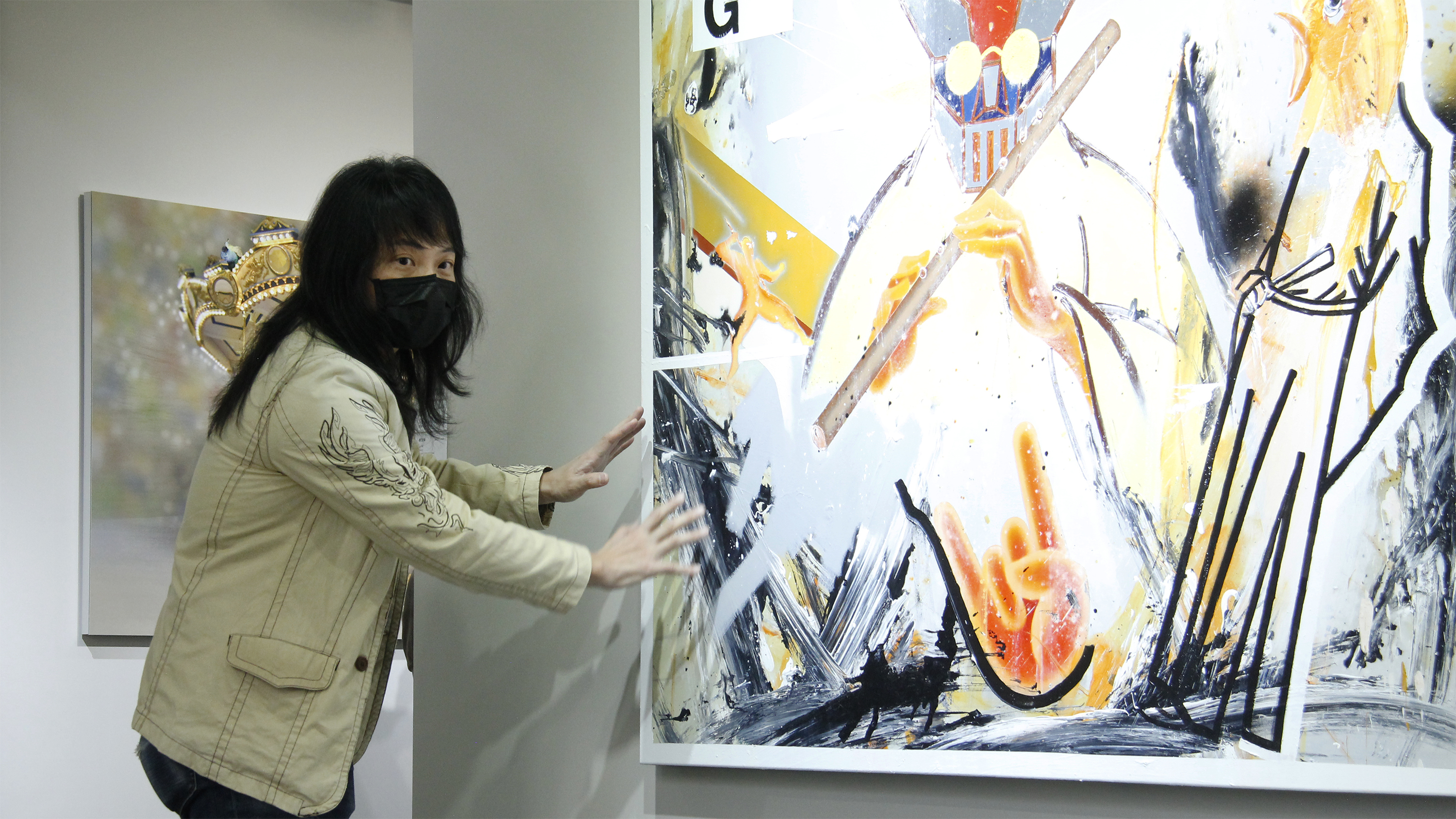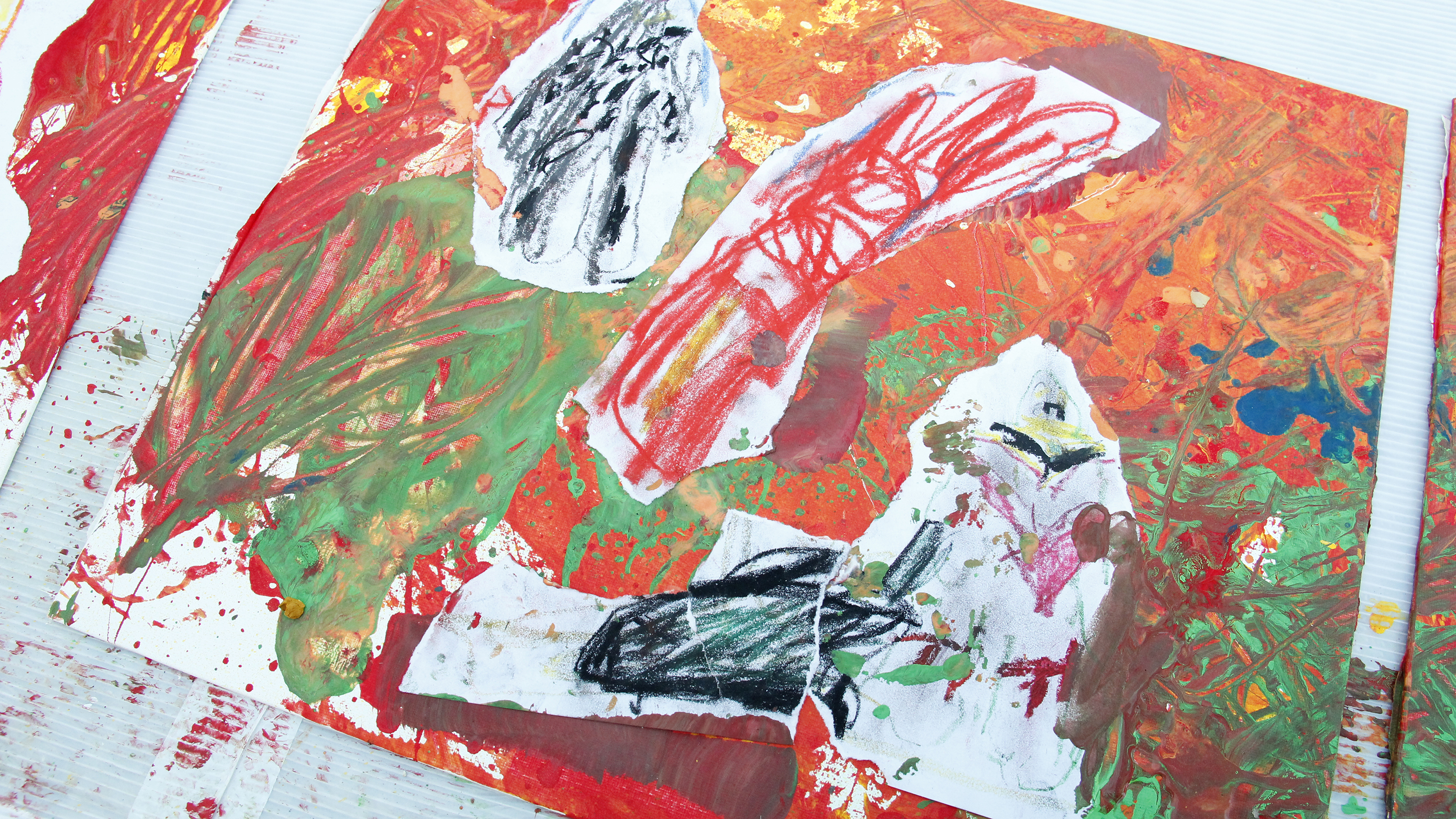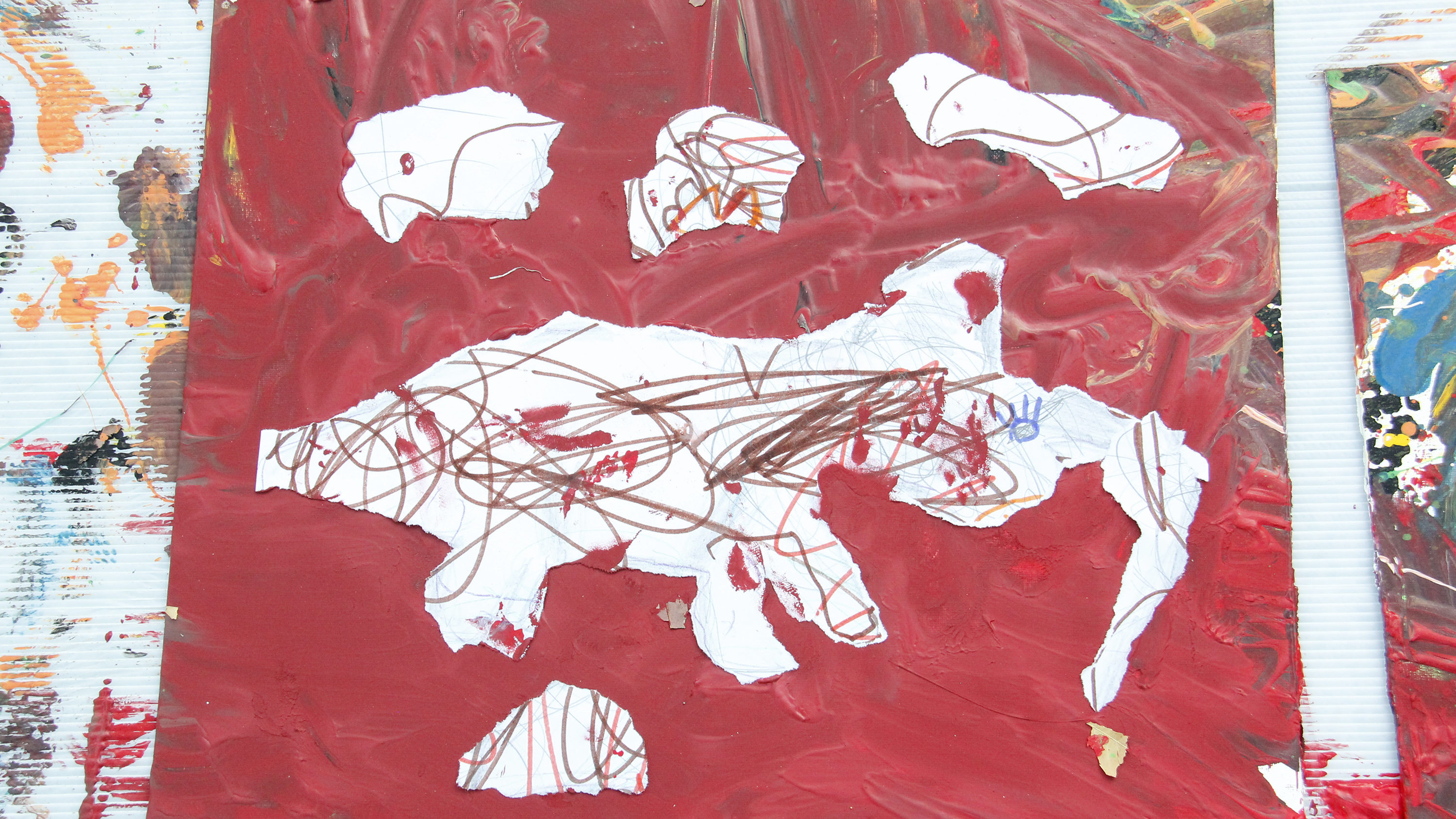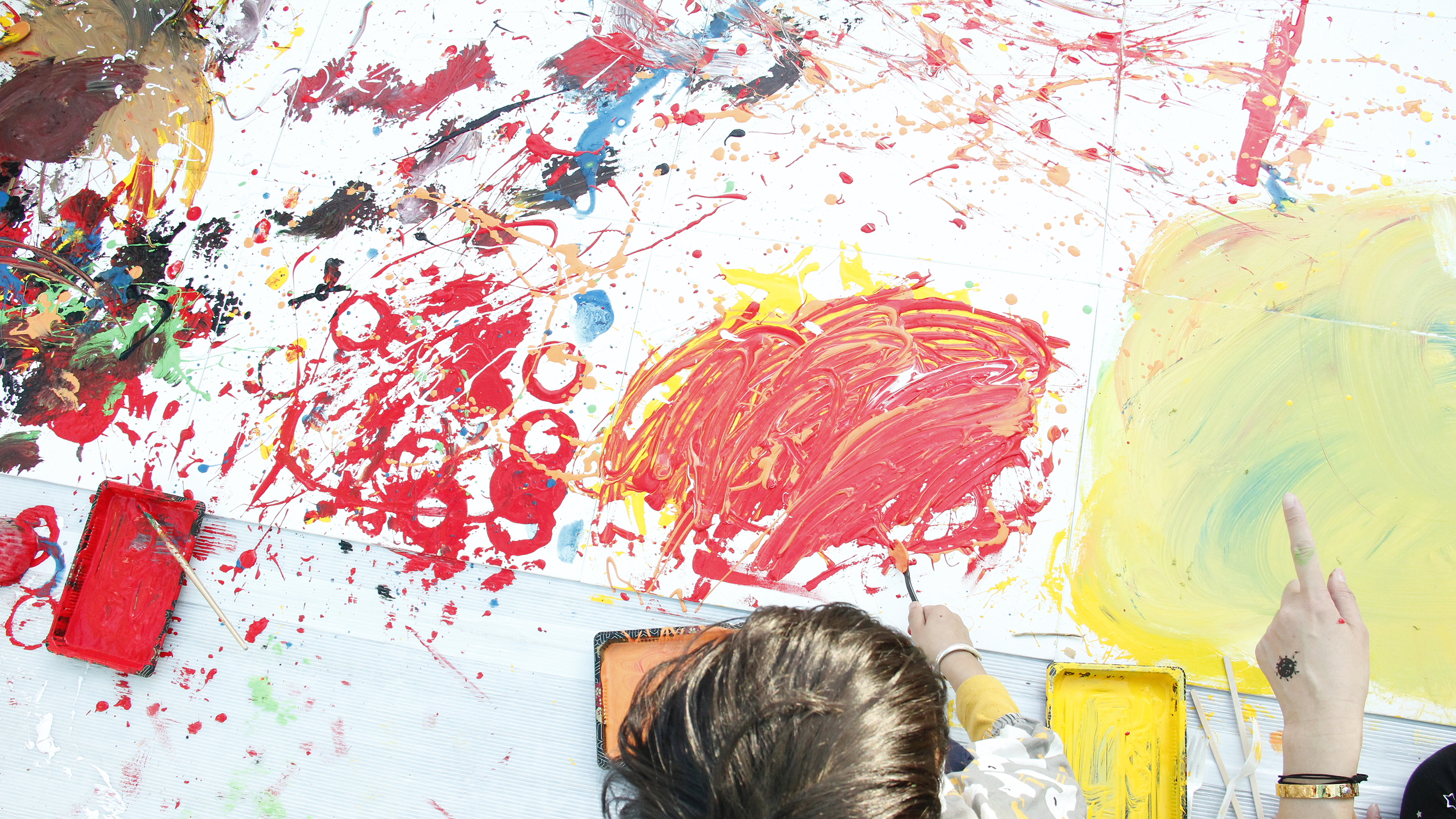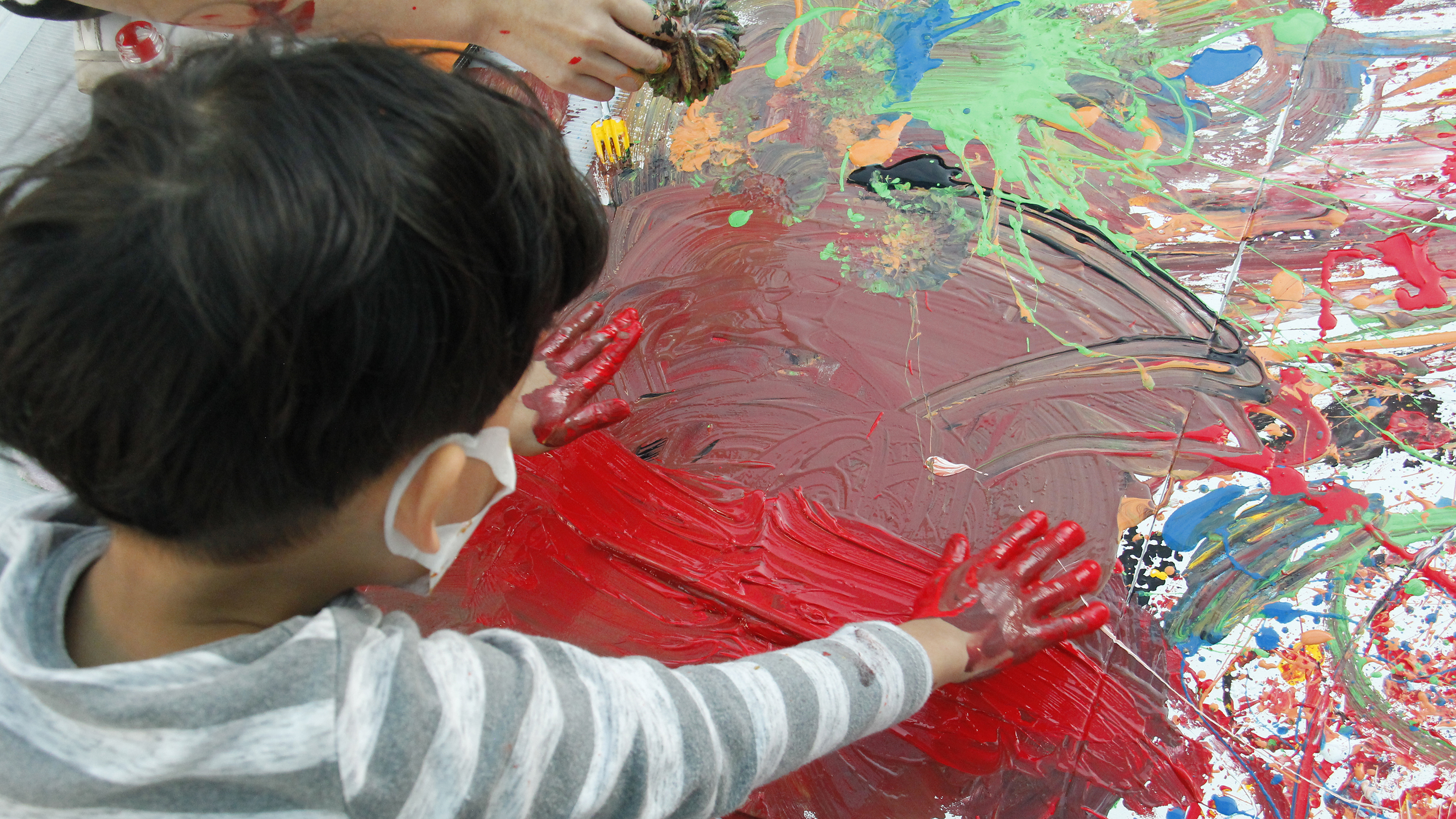 蔡宜儒藝術家以導覽作品做為前導,讓孩子們嘗試將心愛玩具帶進創作思考,拋棄畫筆的概念用廢棄物去沾取顏料、潑灑油漆創作,正是蔡宜儒本次展覽的創作精隨。