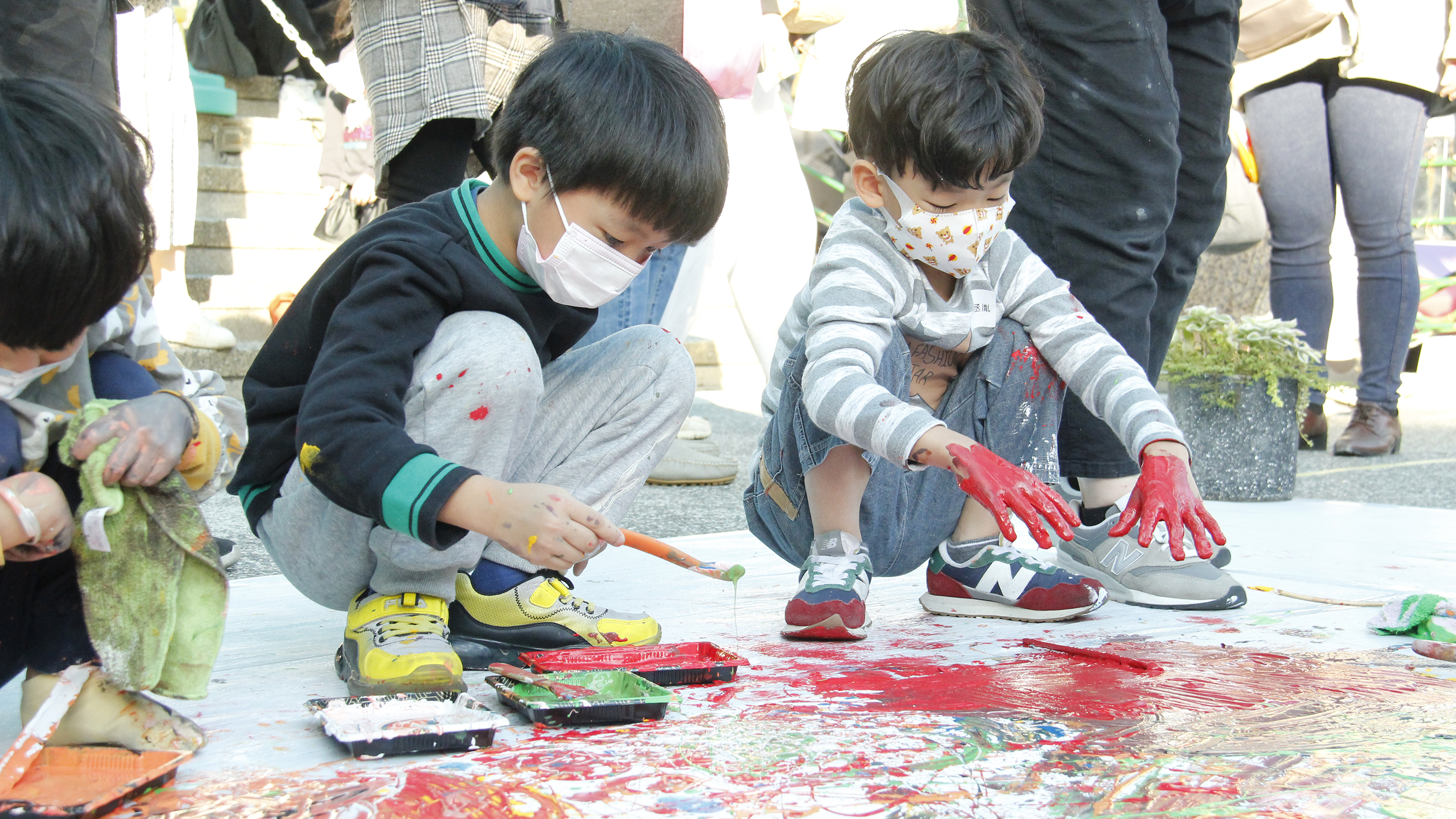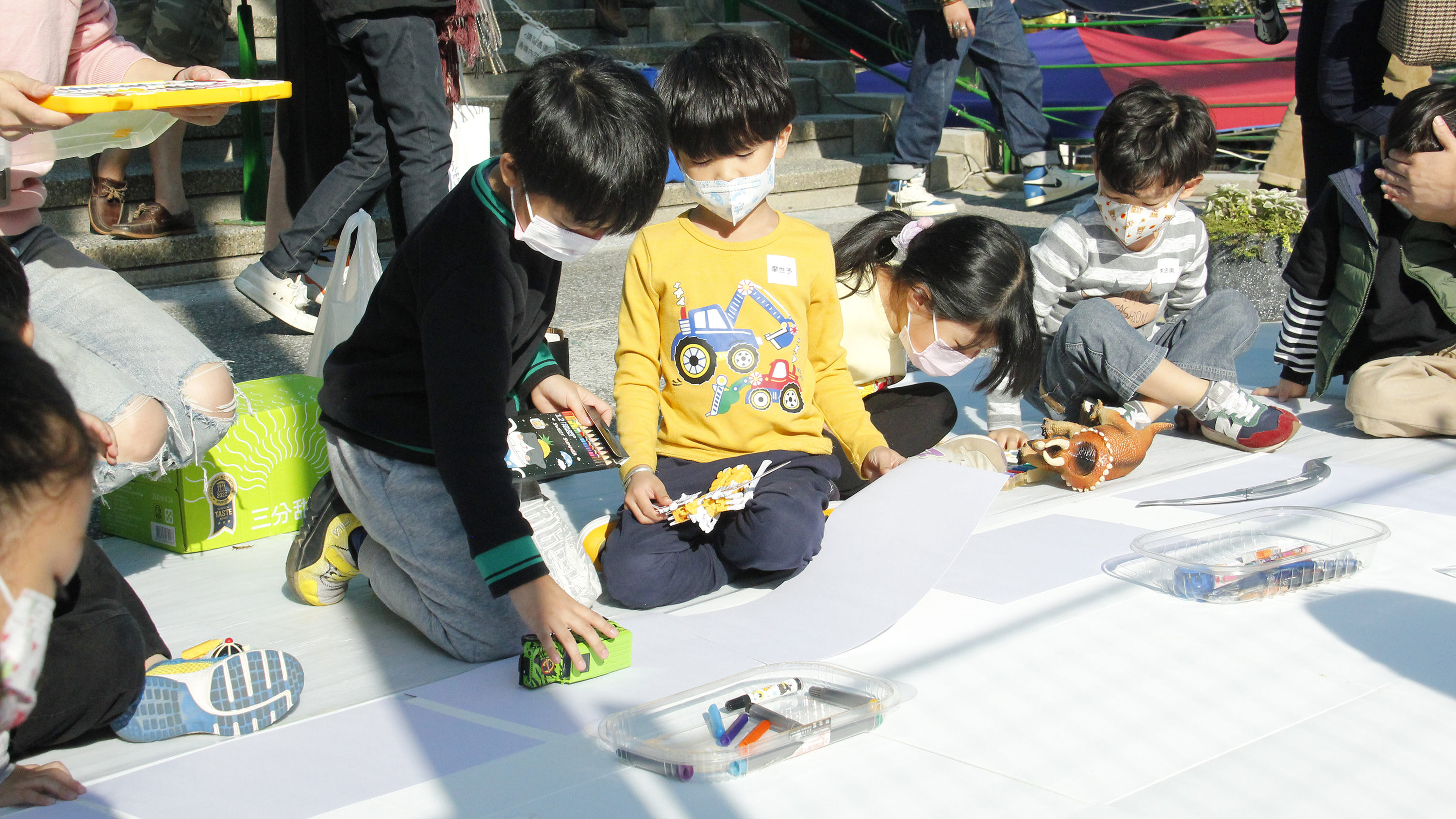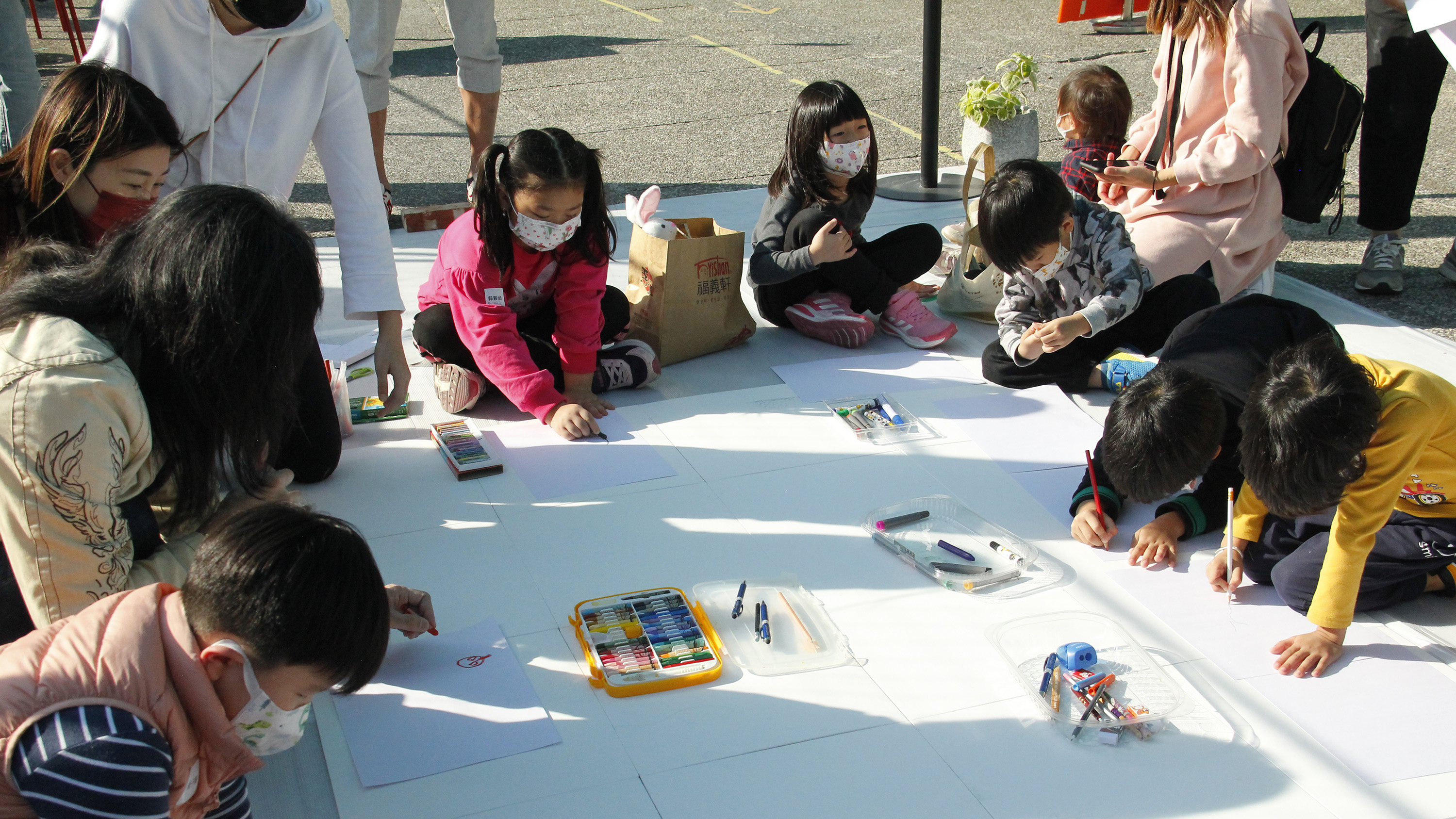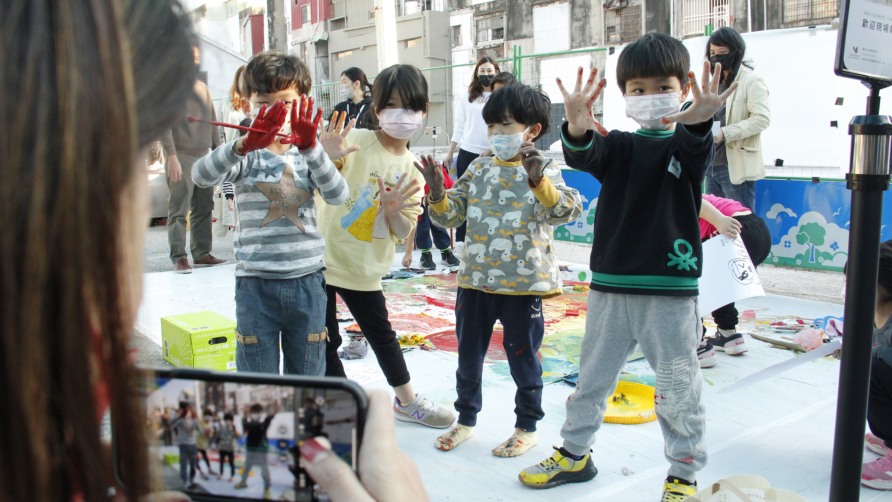 孩子們在超過200公分的大畫布上探索不同媒材去創作出各種圖像的視覺效果,觀察自己心愛的玩具並描繪下來與隔壁的新朋友分享,體驗親手塗抹的肢體創作。孩子跟爸爸媽媽一起畫了喜歡的英雄角色、玩具,悠遊在童趣想像的世界裡,收藏童年記憶與心愛的玩具,將美好封存在2022的平安夜。