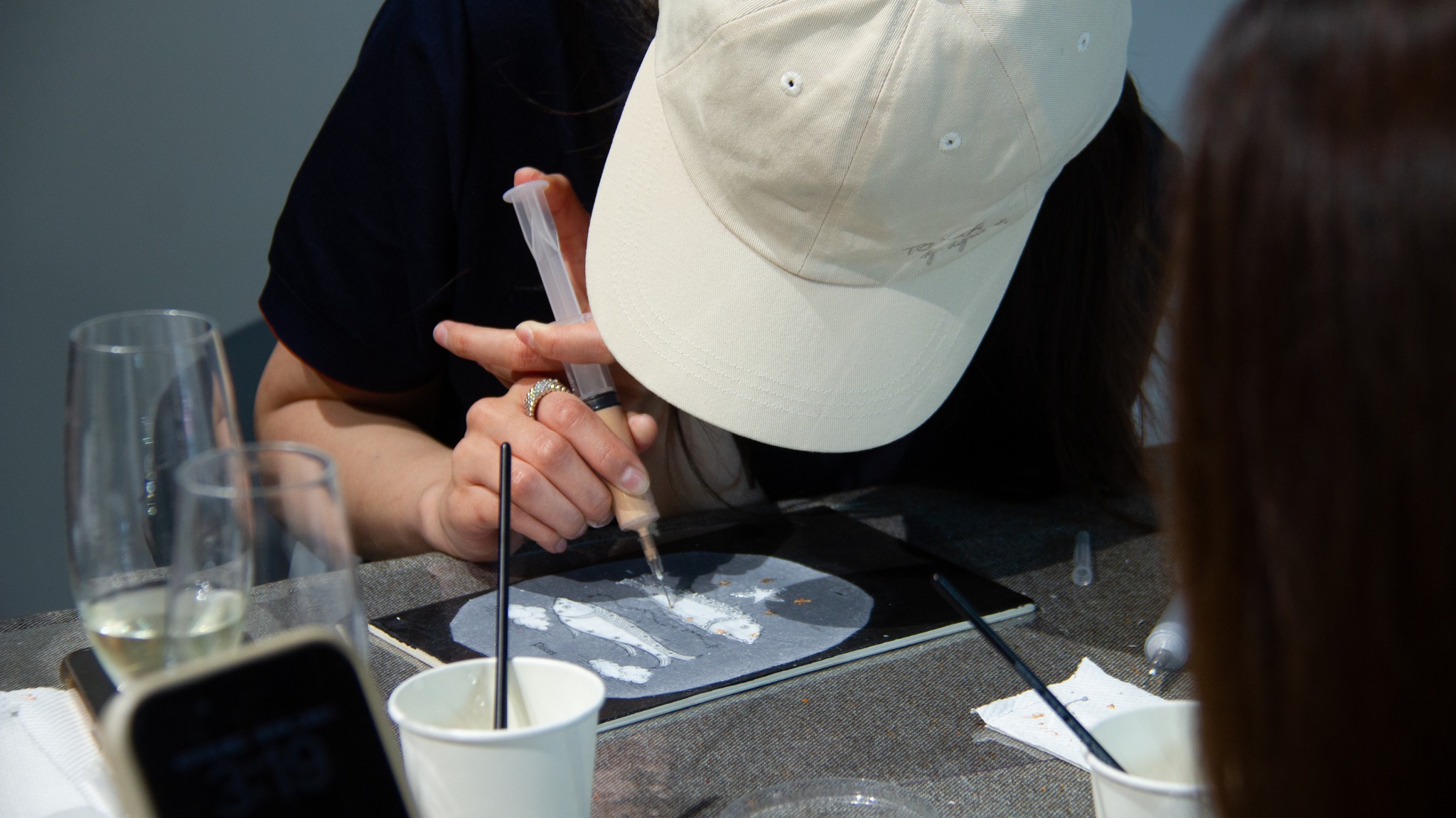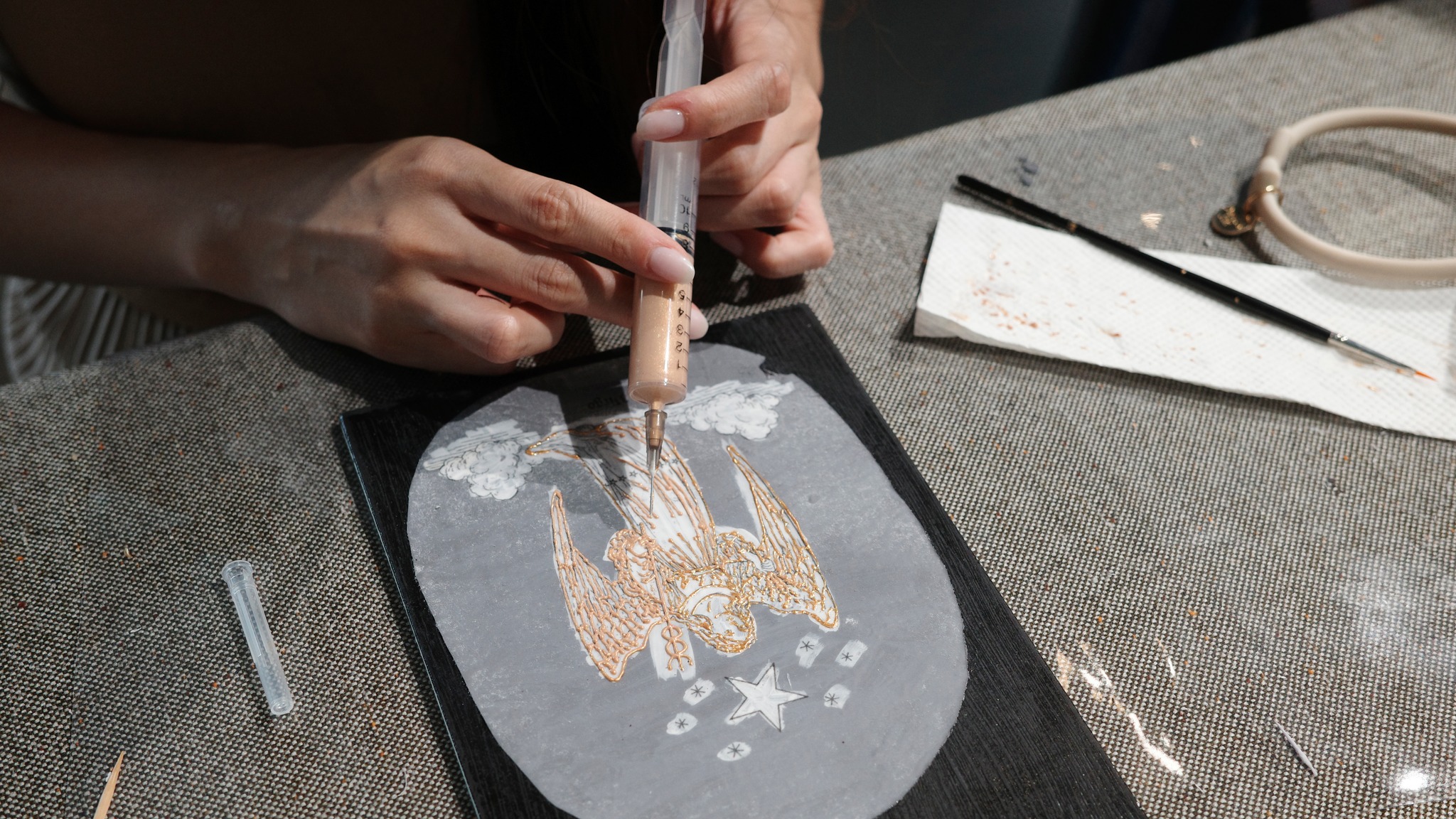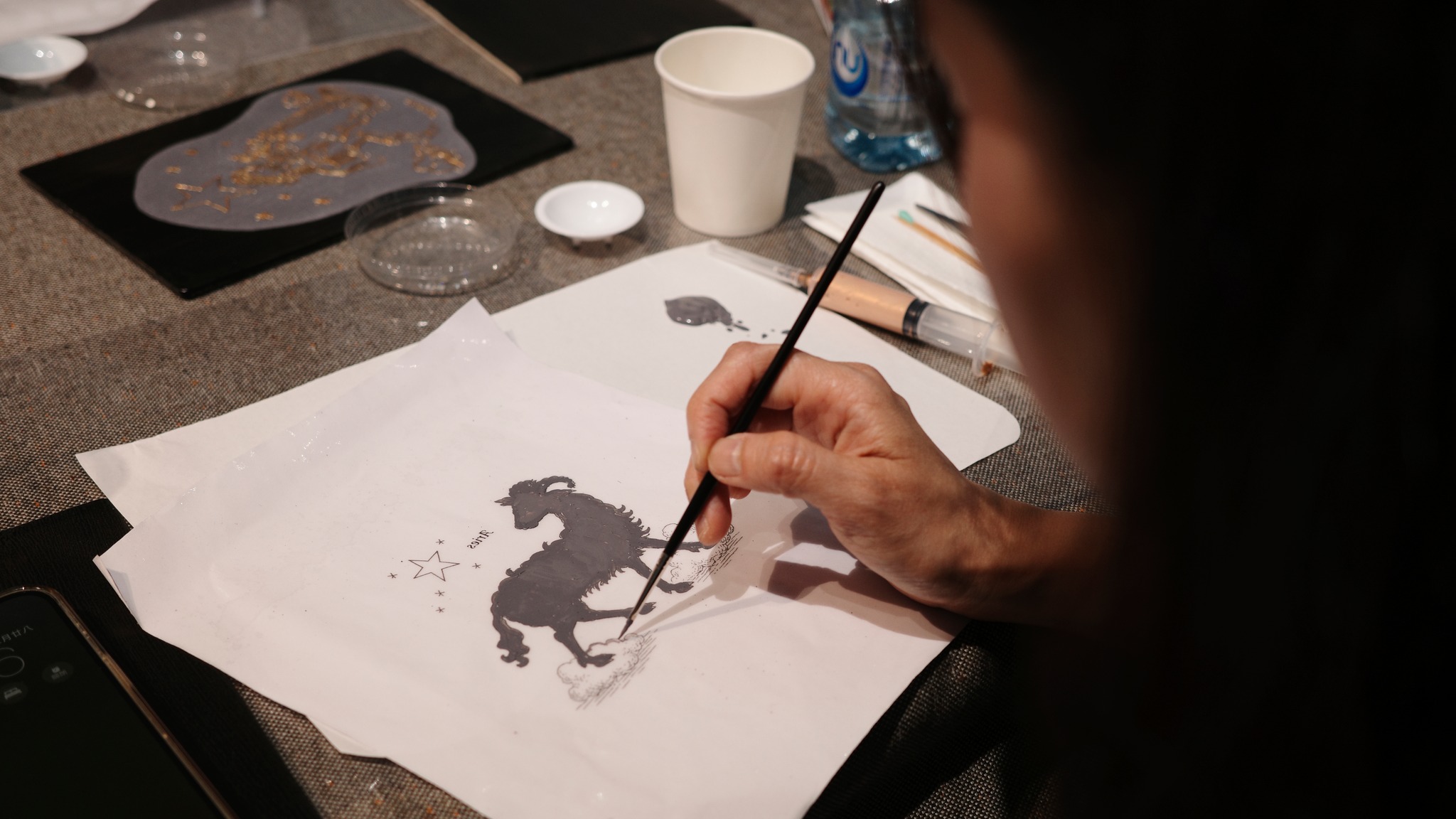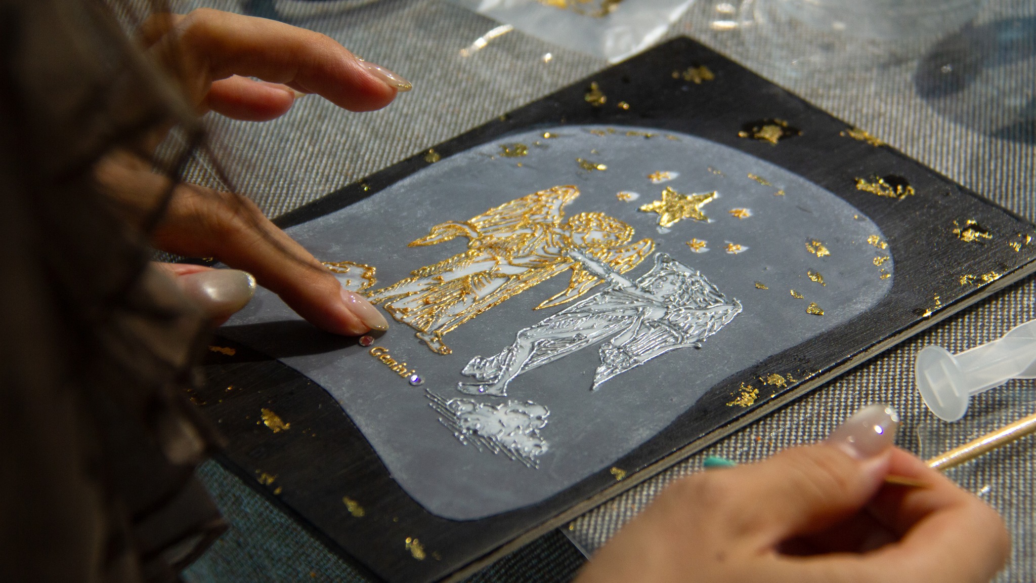 從展間導覽揭開序幕,我們一起走進藝術家的創作宇宙,理解他為何以針筒取代筆觸,描繪出獨特而細膩的星座圖像。在創作體驗中,大家親手感受針筒運行的力道與節奏,看似簡單,卻需要長時間手部穩定與眼力考驗,才能將線條一層層堆疊成立體浮雕般的星圖,再細心貼附金箔與施華洛世奇水晶,讓每一件作品都閃耀出專屬自己的星辰光芒。
