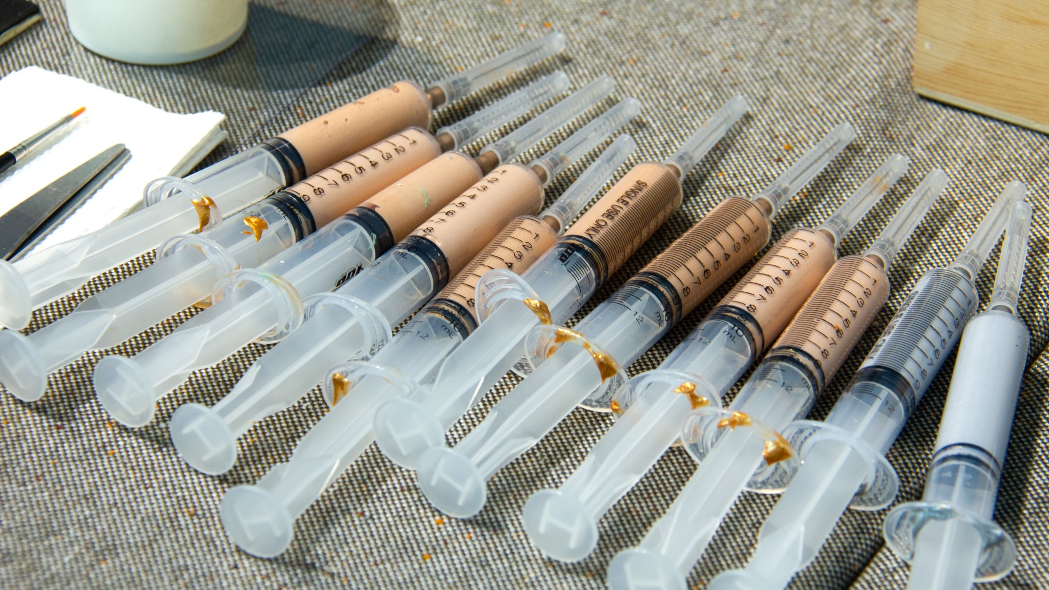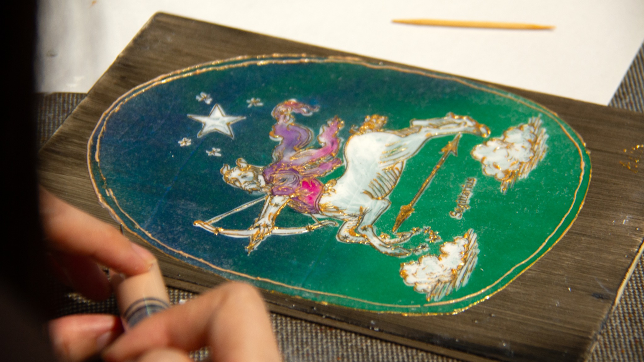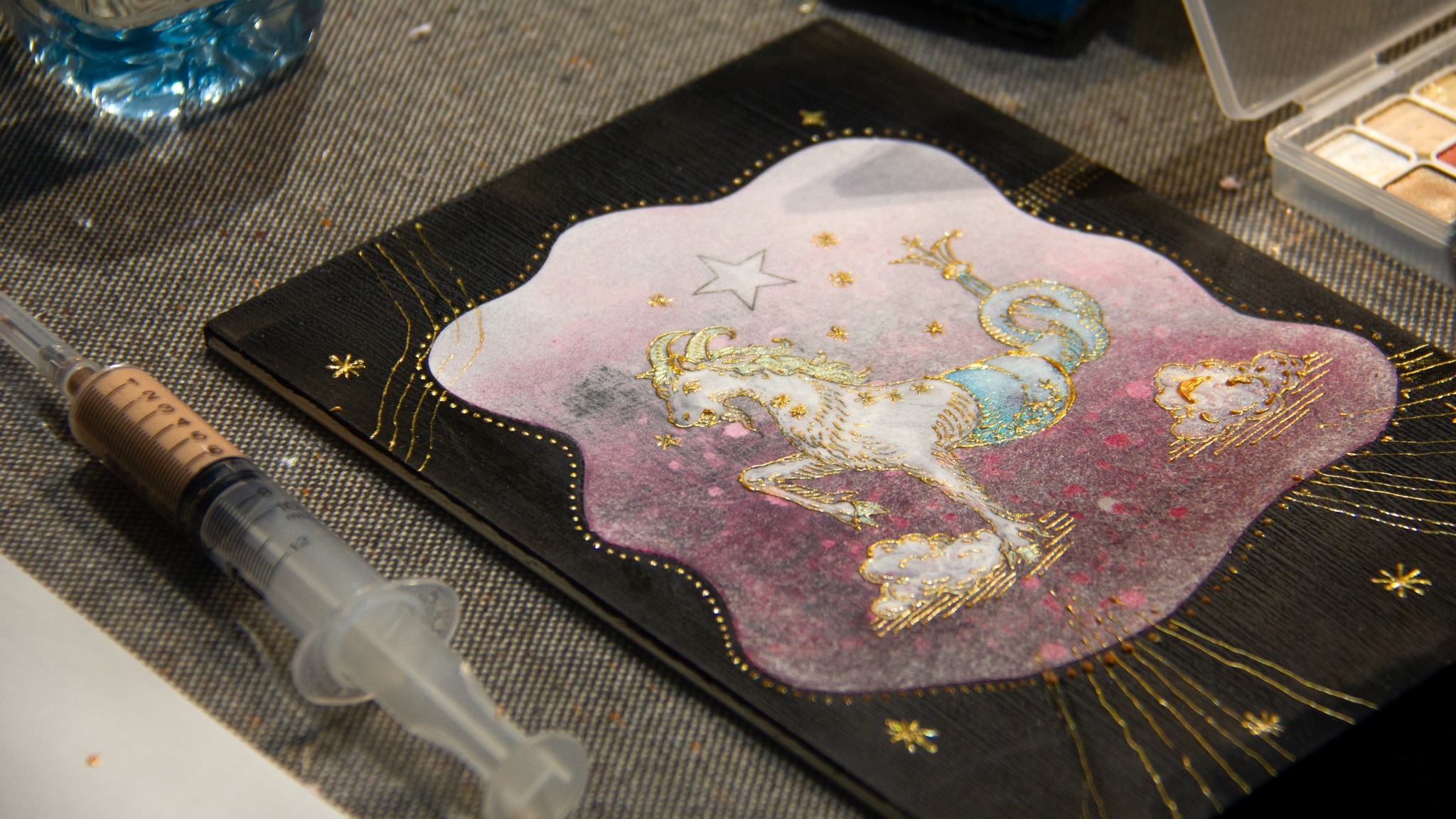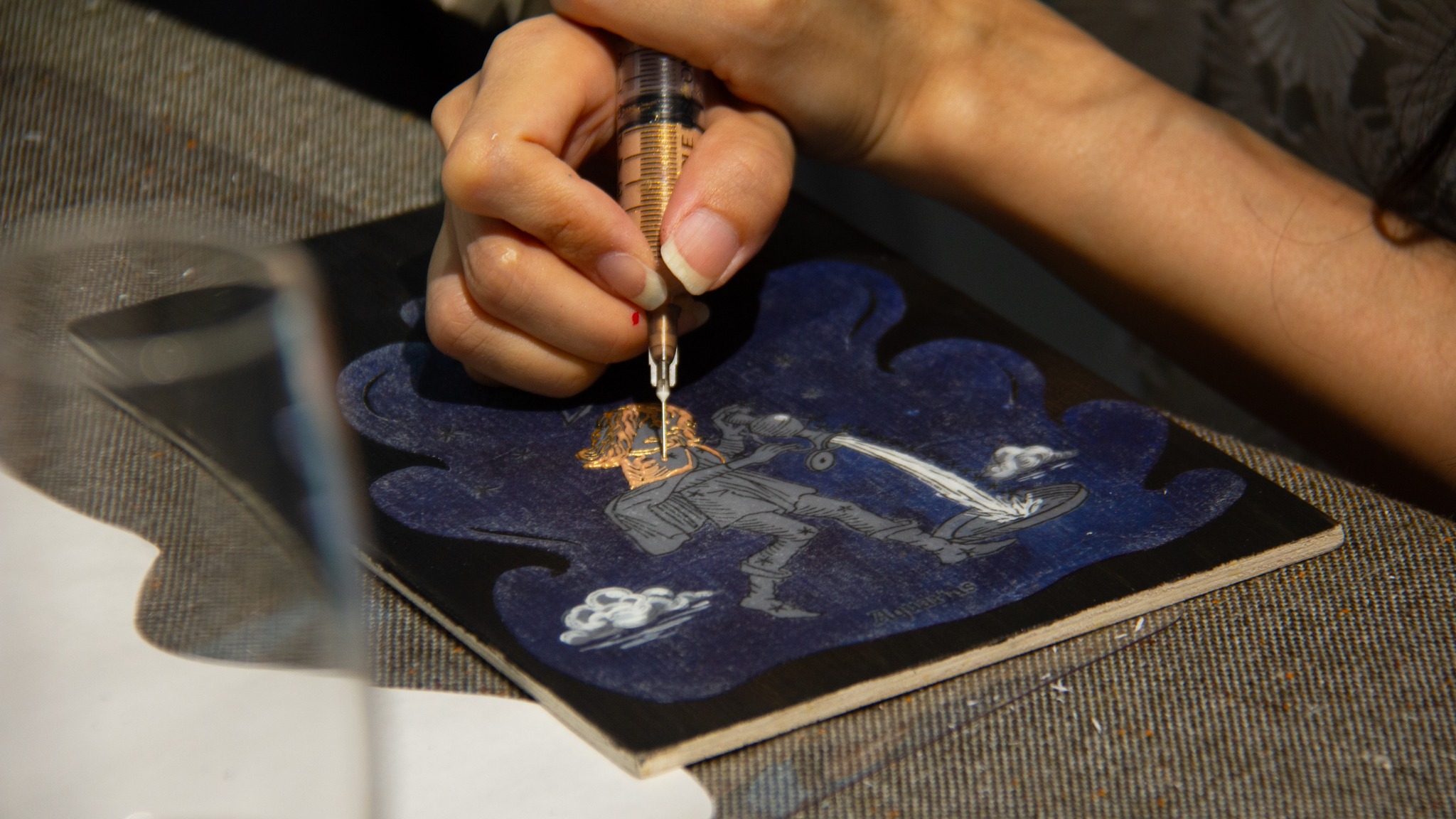 從展間導覽揭開序幕,我們一起走進藝術家的創作宇宙,理解他為何以針筒取代筆觸,描繪出獨特而細膩的星座圖像。在創作體驗中,大家親手感受針筒運行的力道與節奏,看似簡單,卻需要長時間手部穩定與眼力考驗,才能將線條一層層堆疊成立體浮雕般的星圖,再細心貼附金箔與施華洛世奇水晶,讓每一件作品都閃耀出專屬自己的星辰光芒。