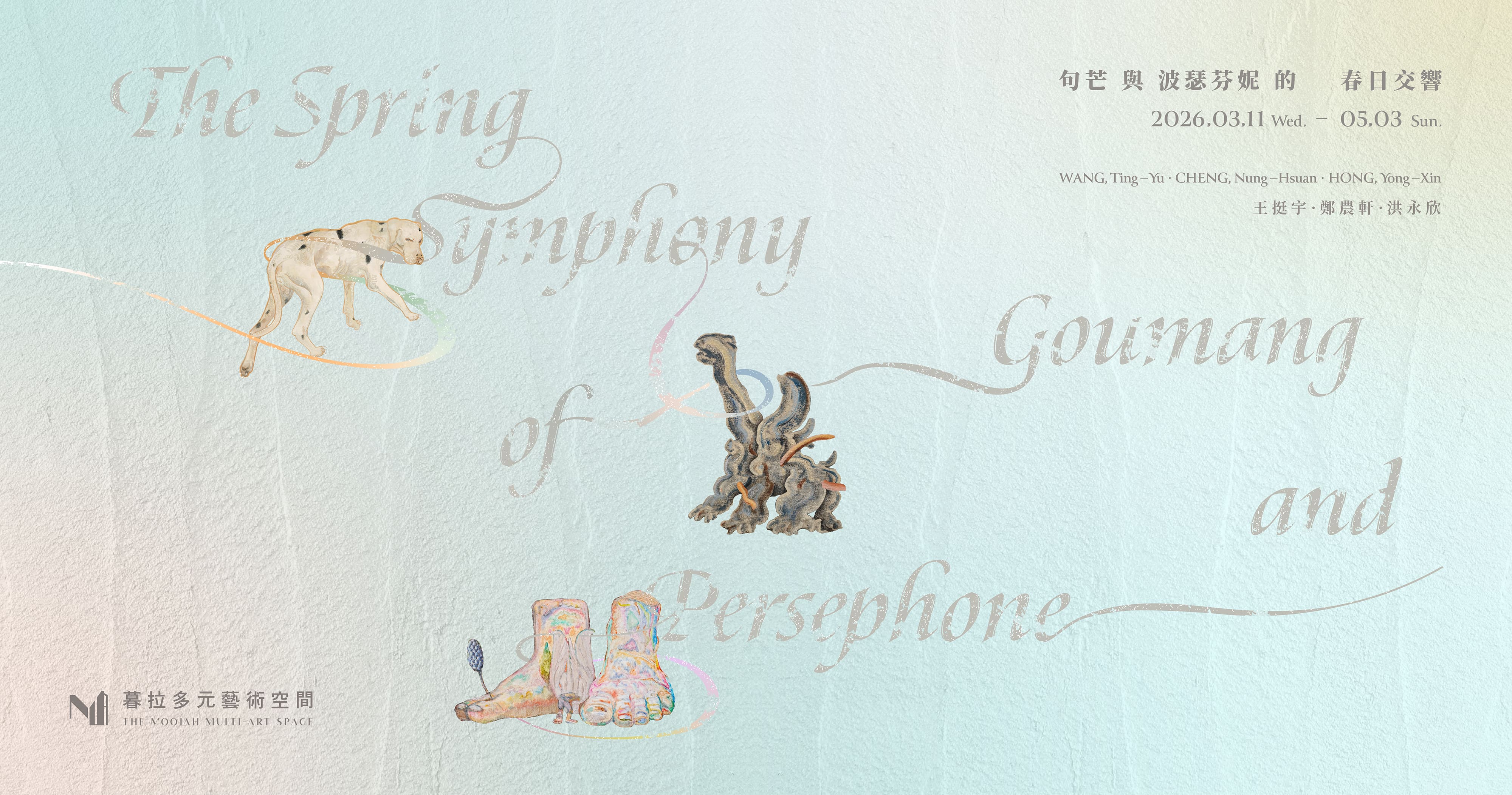 𝐓𝐡𝐞 𝐒𝐩𝐫𝐢𝐧𝐠 𝐒𝐲𝐦𝐩𝐡𝐨𝐧𝐲 𝐨𝐟 𝐆𝐨𝐮 𝐌𝐚𝐧𝐠 𝐚𝐧𝐝 𝐏𝐞𝐫𝐬𝐞𝐩𝐡𝐨𝐧𝐞|𝗔𝗿𝘁𝗶𝘀𝘁𝘀 WANG, Ting-Yu / CHENG, Nung-Hsuan / HONG, Yong-Xin|𝗗𝗮𝘁𝗲 Mar 11 – May 3, 2026|10:30 – 19:00 (Mon. – Sun.)|𝗩𝗲𝗻𝘂𝗲 The Moolah Multi – Art Space|𝗔𝗱𝗱𝗿. No.15, Sec. 3, Guohua St., West Central Dist.,Tainan City 700, Taiwan (R.O.C.)