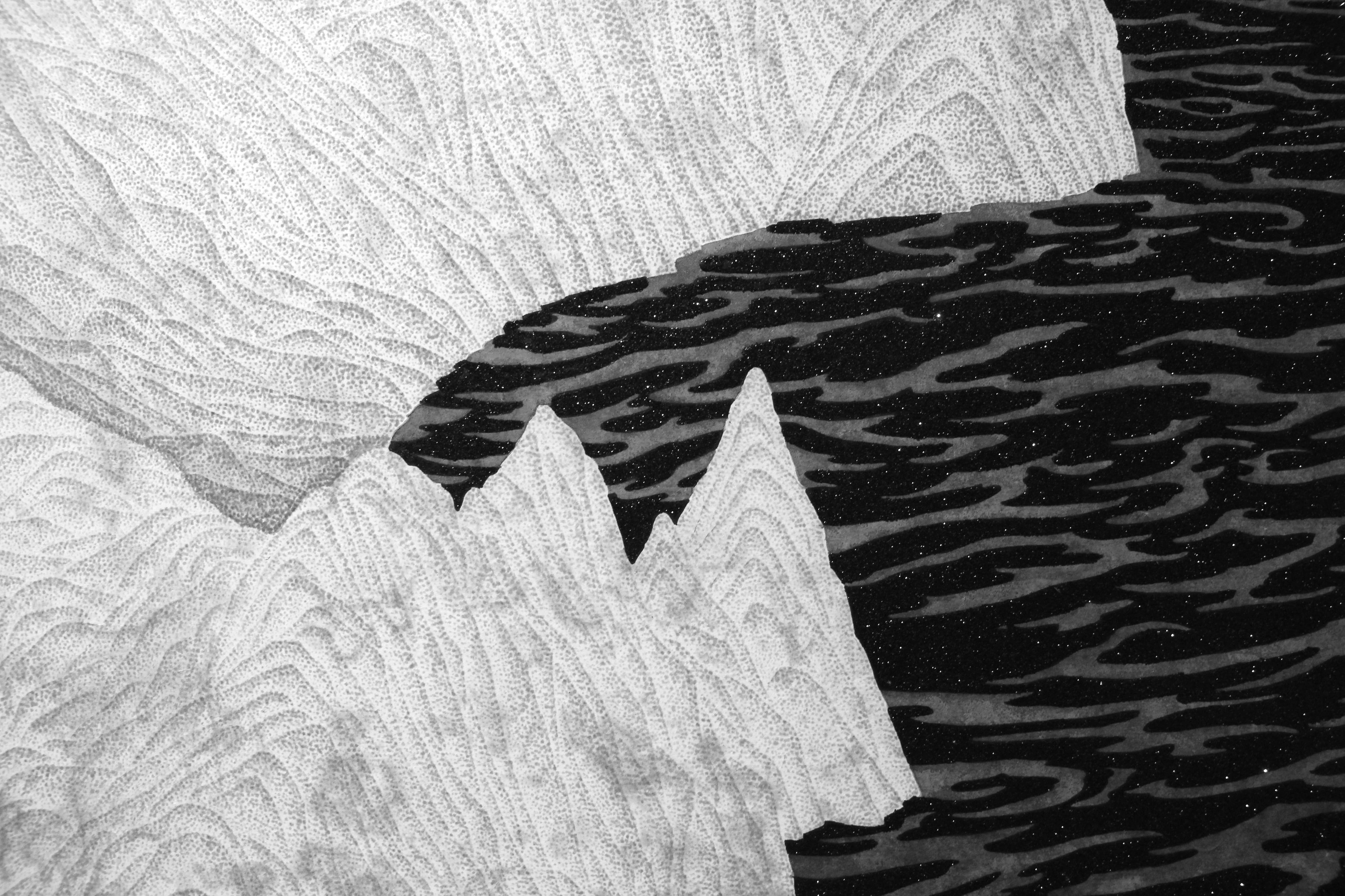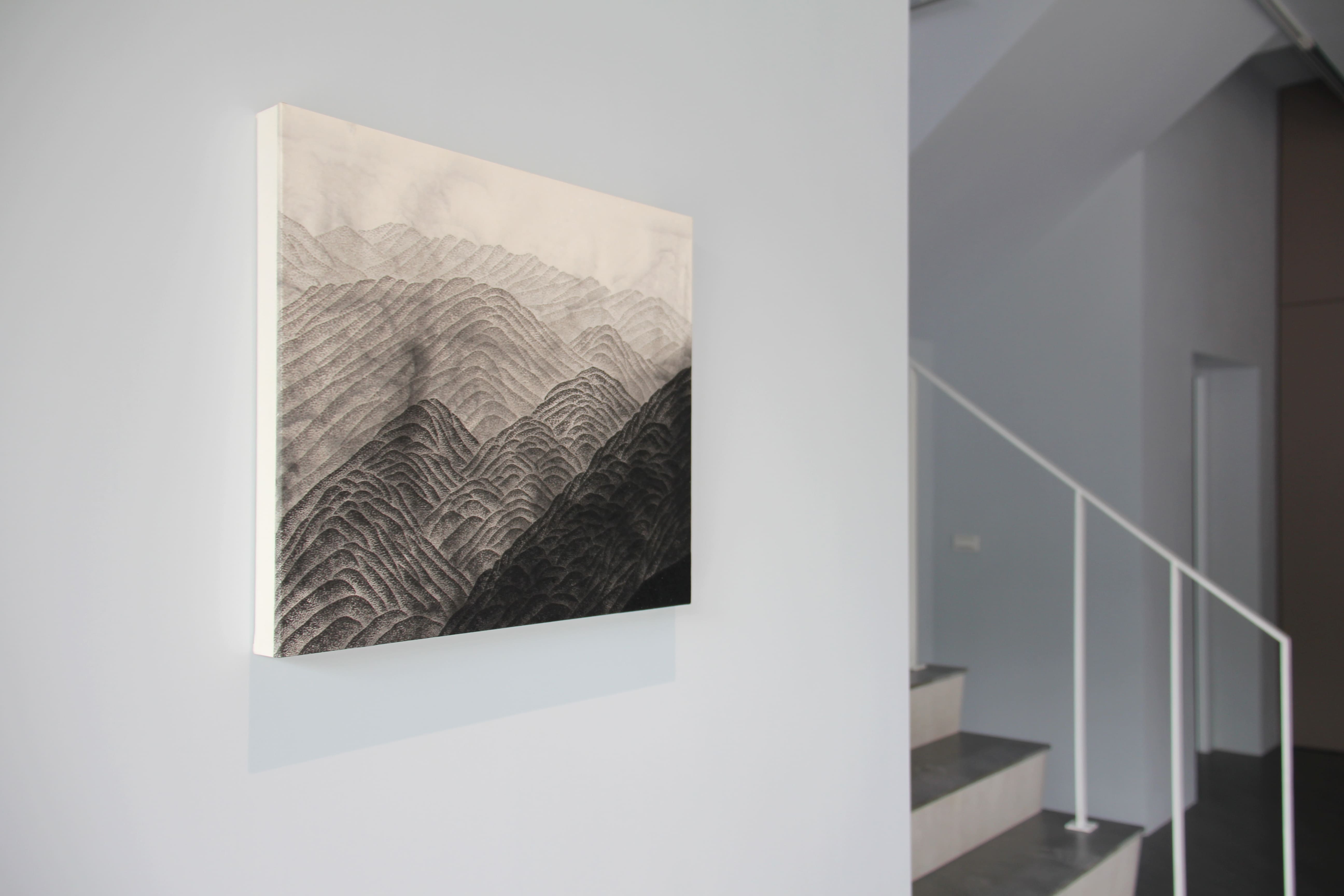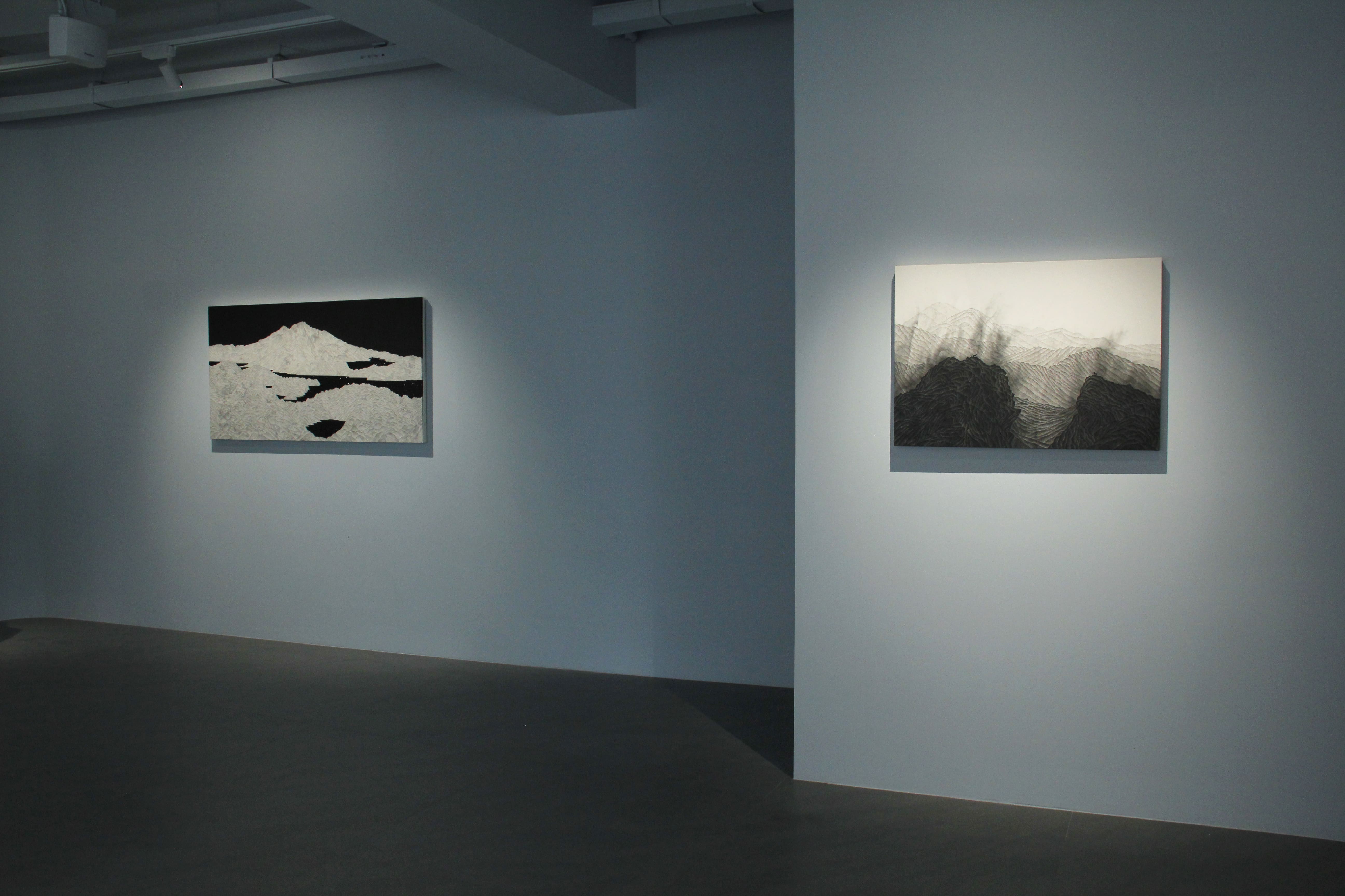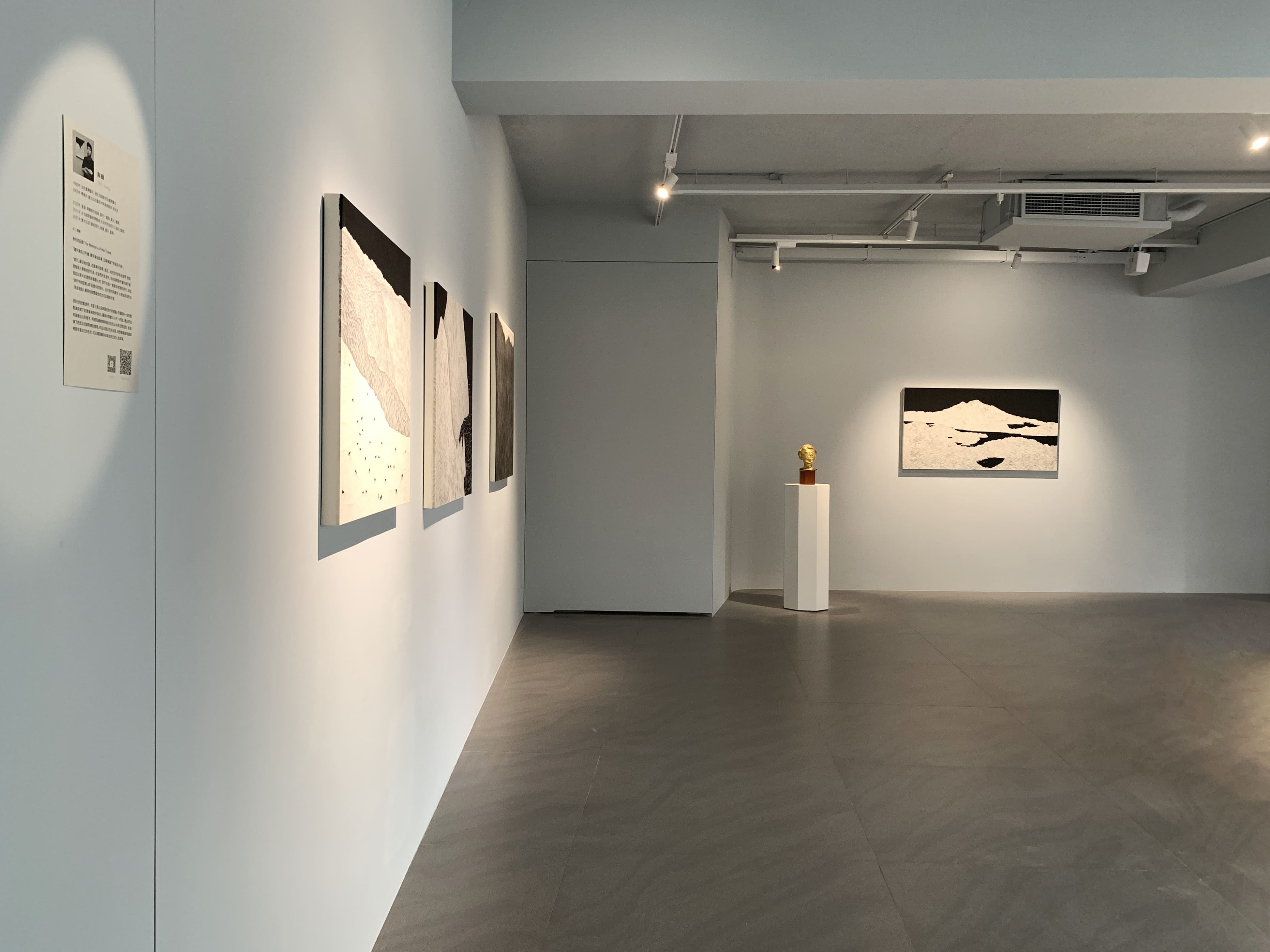 陶綱的「山形」來自於自身過往旅行的經驗,藝術家似乎是透過自身的每個步伐與記憶,將其轉化為無數濃淡深淺、層次相異的「點」,以點描繪出植披景觀、風景遠近,甚或情感痕跡,在墨韻的融接與行旅的氣息傳遞中,使觀者的雜念化約於純粹的單色畫面裡,一切的紛亂都在墨點裡被消融。作品中細膩的黑白灰,展現了不同季節與時序的景色變化,這看似簡單卻意念綿密的堆疊,藝術家提供了記憶與視線的索引,引領著人們重新體會自由探索的真正意義。