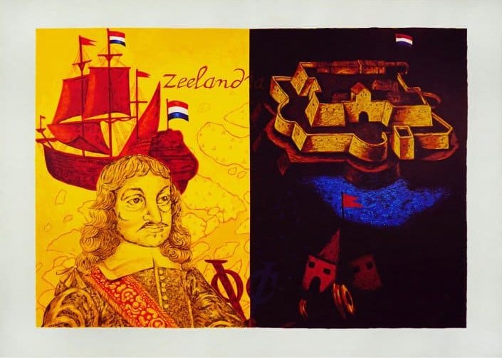 〈熱蘭遮紀事〉與同時期的MADE IN TAIWAN系列有相互呼應的意義,也是楊茂林90年代初期〈大員紀事〉等作品的延伸。1624年荷蘭提督雷爾生,派人來台築城作為攻防之軍事要地,命名為奧倫治城或熱蘭遮城,即今日的安平古堡,此為臺灣最古的城堡殘跡。鄭成功1661年登陸鹿耳門,荷蘭人退據熱蘭遮城,翌年荷蘭人撤守。鄭成功遷入安平堡,並派員至閩、粵沿海募民來臺屯田、設學校傳佈儒家王道文化。楊茂林從歷史的角度探索臺灣之由來,以最早開發建設臺灣的荷蘭人根據地-熱遮蘭城作背景,並以大航海時代開發臺灣的兩位重要人物-荷蘭總督及鄭成功之半身像互相對應,刻畫出臺灣開拓史的滄桑和幾度面對海外移入者統治的無奈命運。(林育淳/25年典藏精粹)